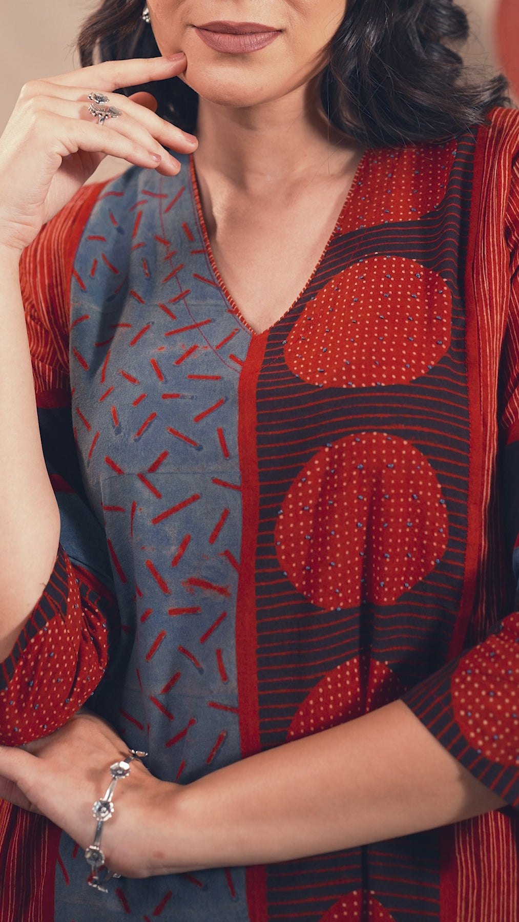 This cotton ajarakh kurta in maroon features a five-block print with eye-catching circle designs and intricate embroidery. The V neckline, collar stand and decorative knots add details to enhance the look. Ideal for both casual and semi-formal occasions, it combines comfort with stylish design.