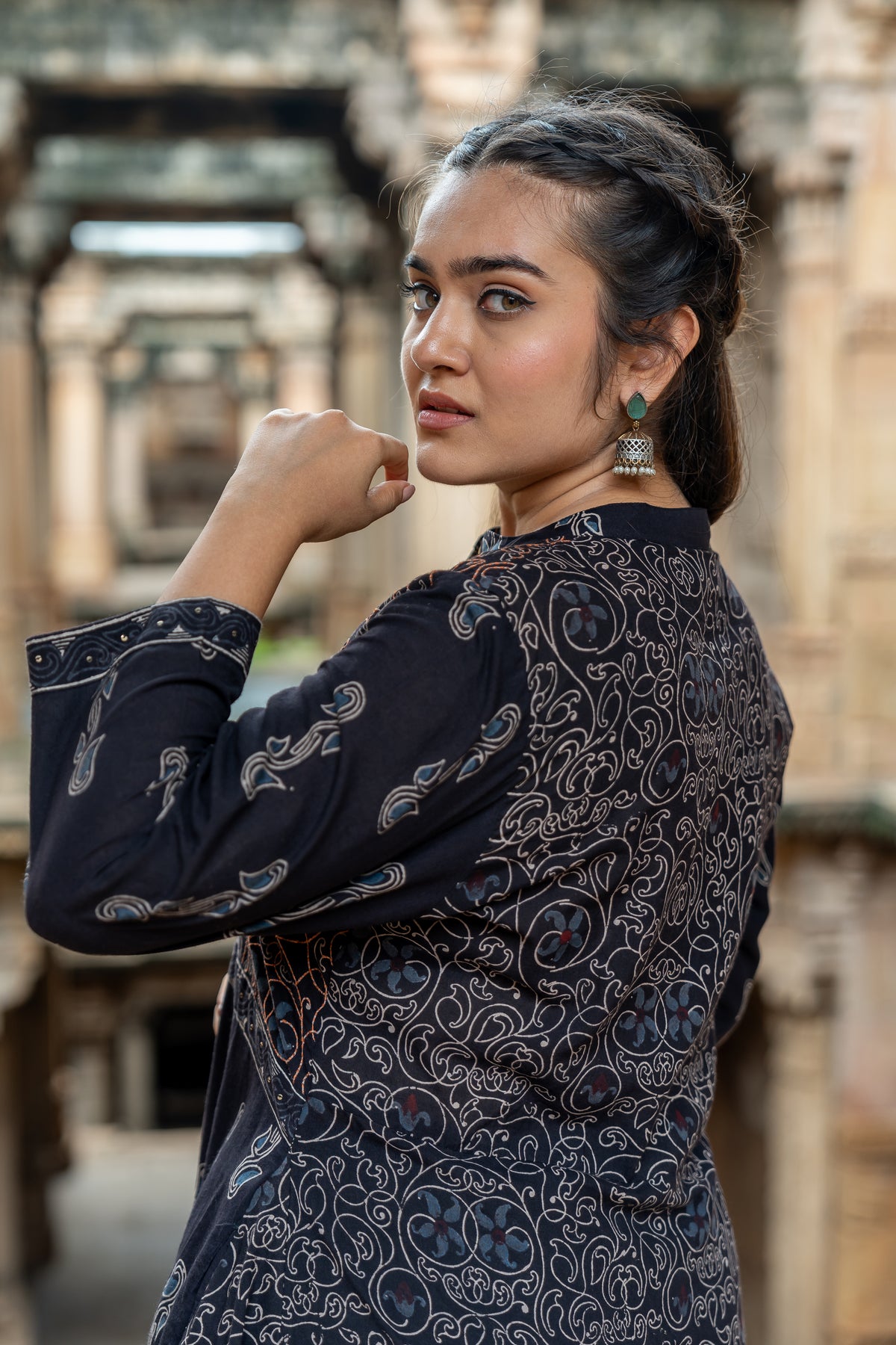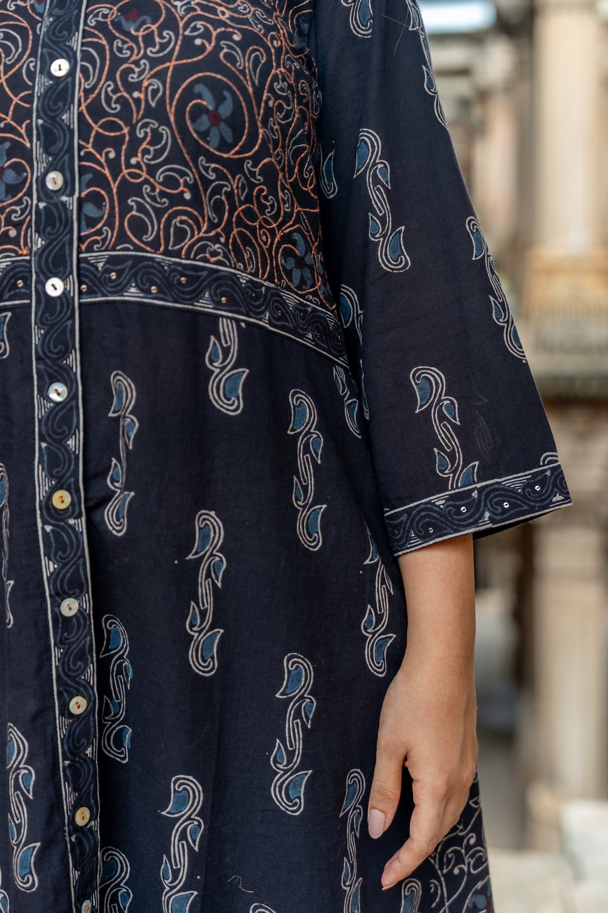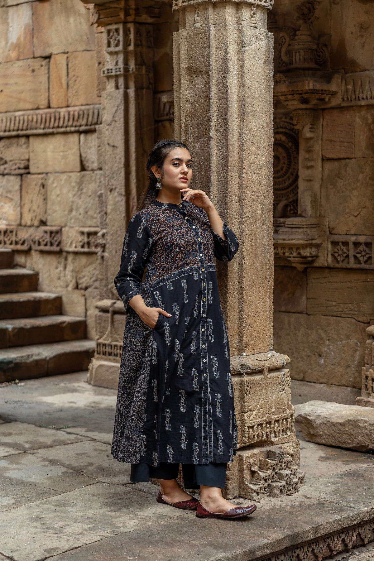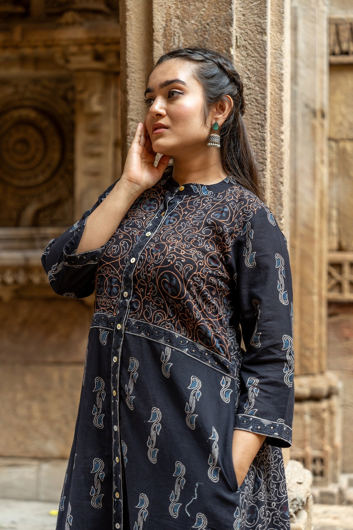 A modern shirt-inspired kurta in black Ajrakh hand block print, featuring dual prints and a delicate border detail. Contrast hand embroidery graces the front and sleeves, while functional pockets make it perfect for all-day wear.