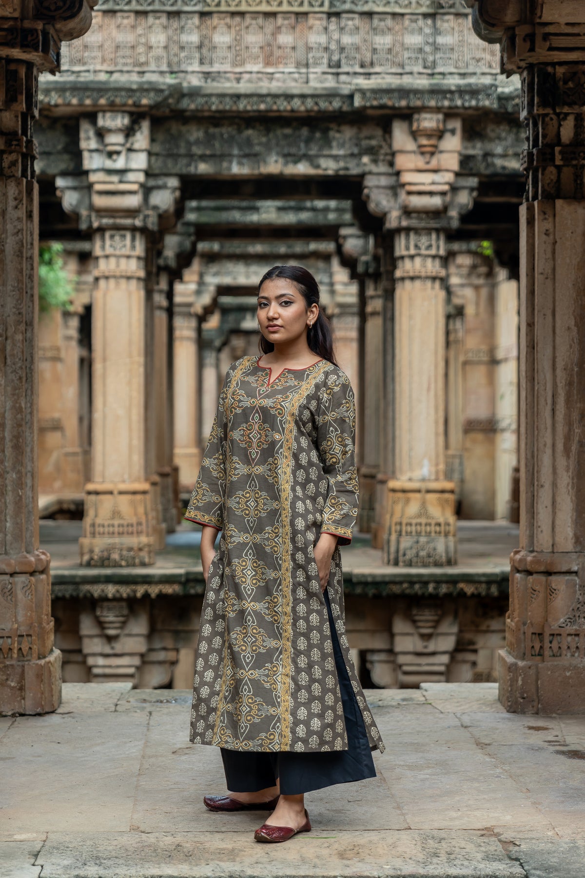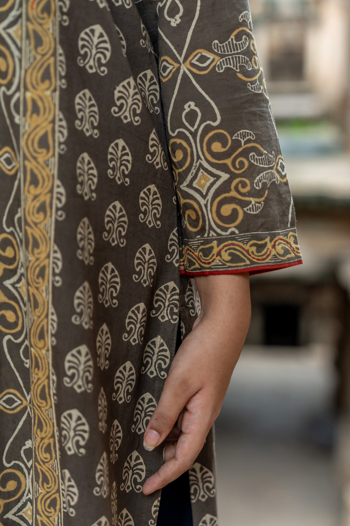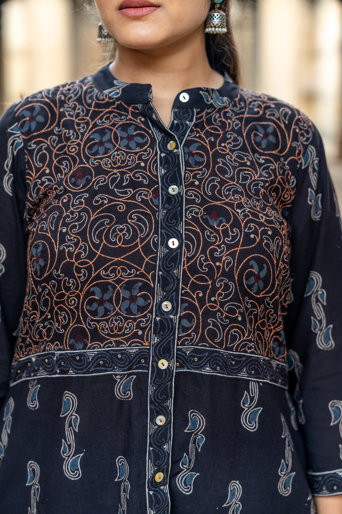 A modern shirt-inspired kurta in black Ajrakh hand block print, featuring dual prints and a delicate border detail. Contrast hand embroidery graces the front and sleeves, while functional pockets make it perfect for all-day wear.