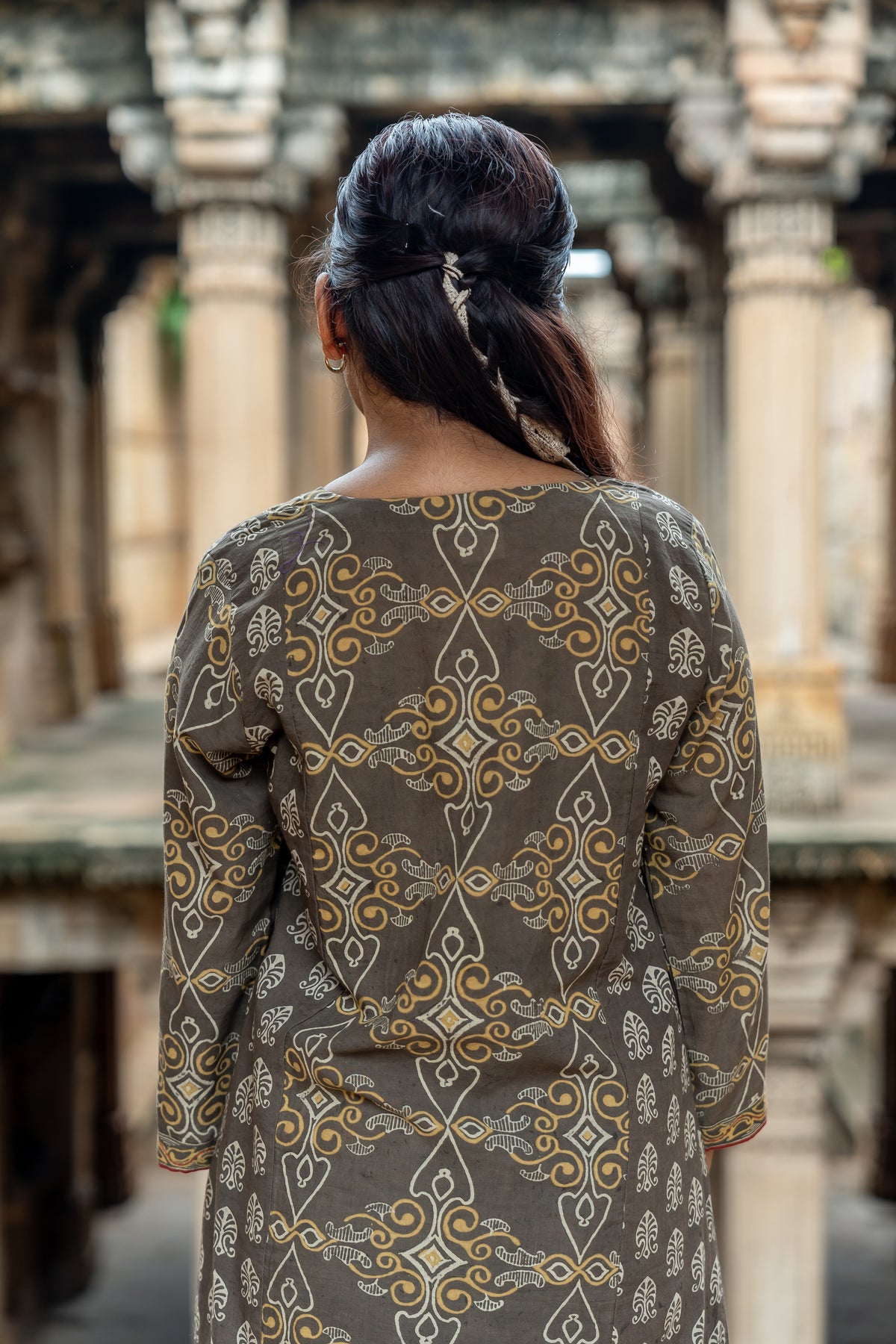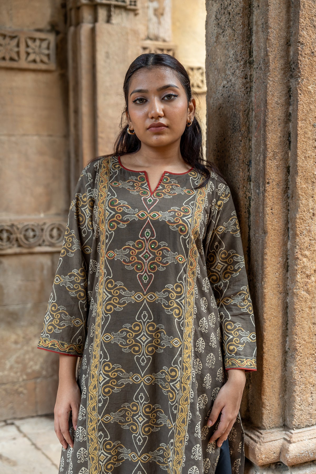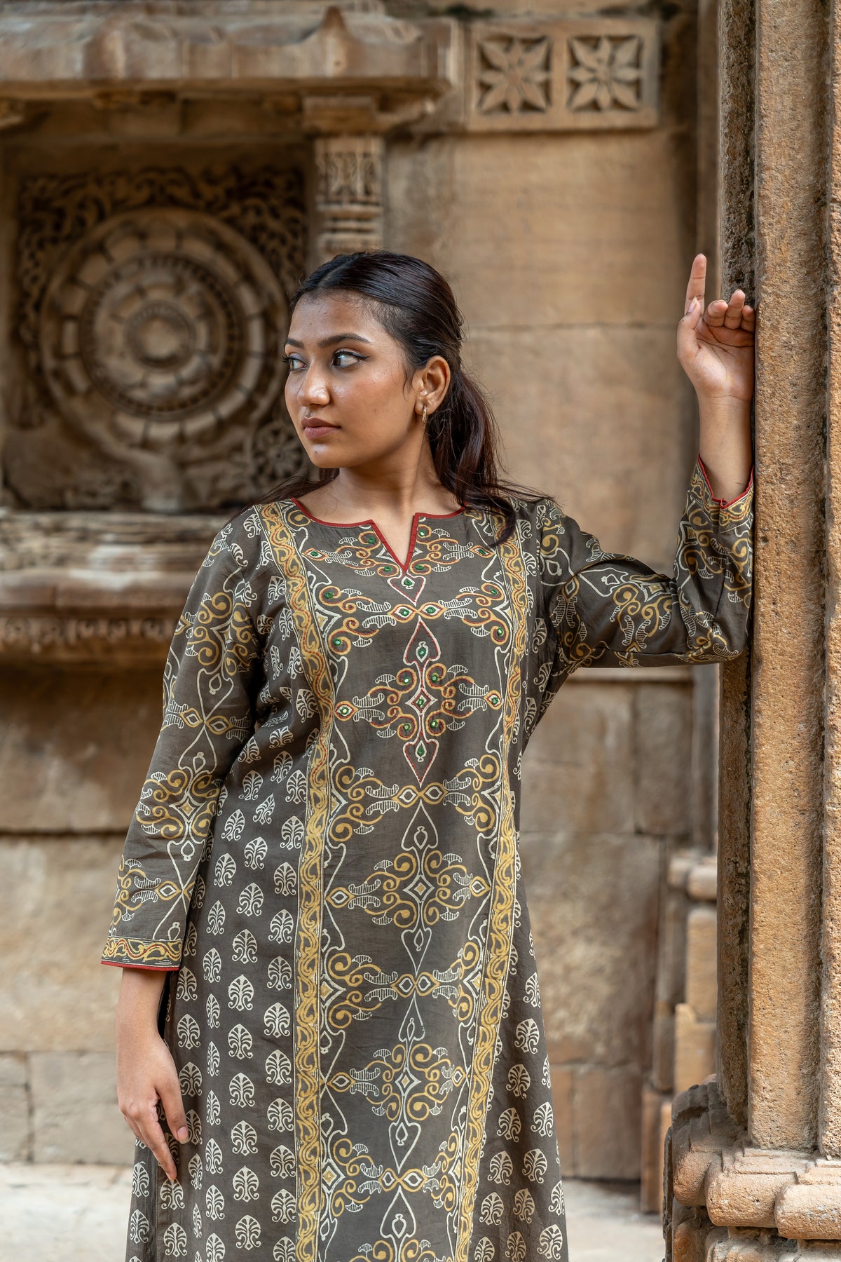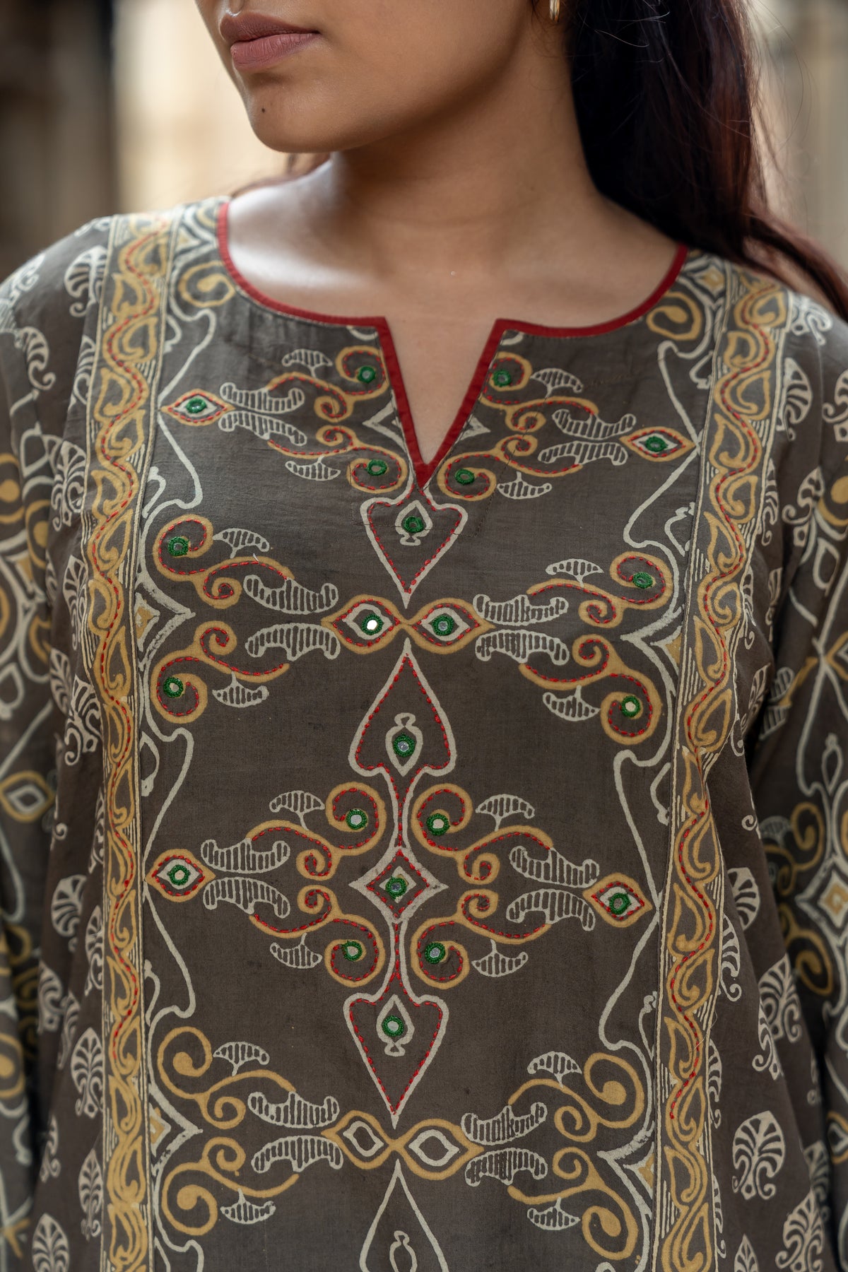 A modern shirt-inspired kurta in black Ajrakh hand block print, featuring dual prints and a delicate border detail. Contrast hand embroidery graces the front and sleeves, while functional pockets make it perfect for all-day wear.