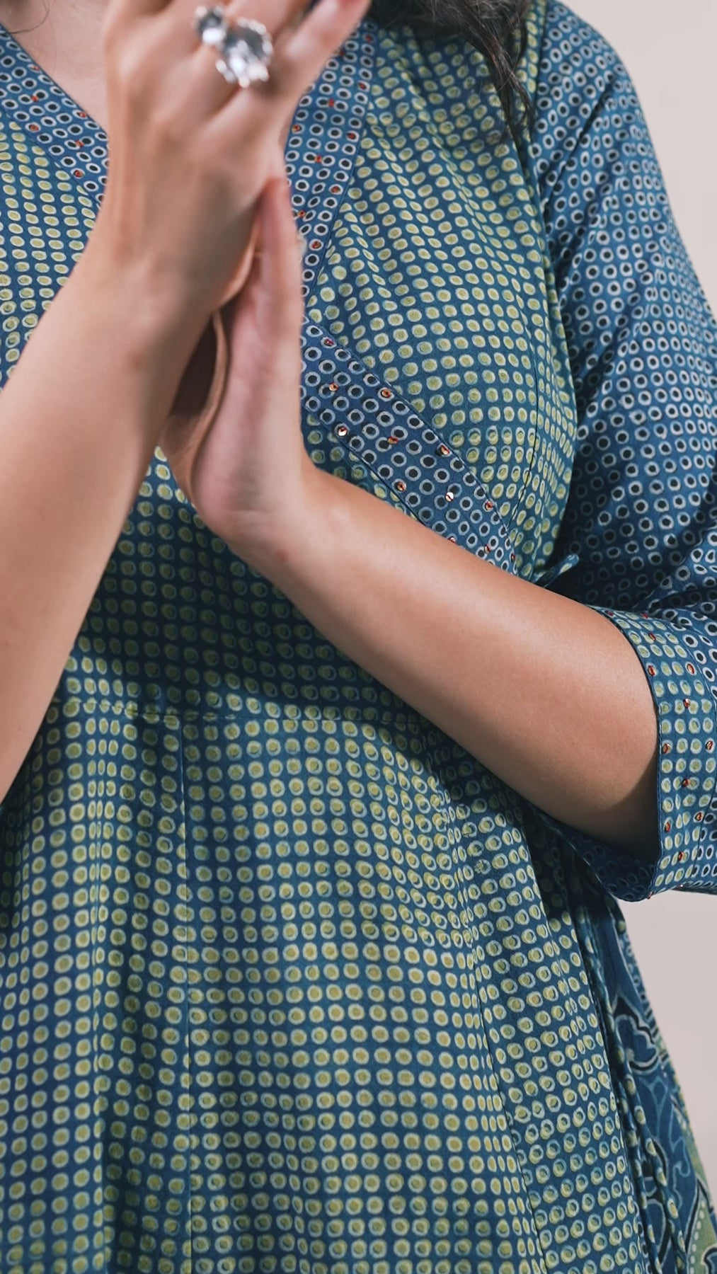 Natural-dyed and printed colours might bleed during the first few washes or rub against the skin & other light-coloured garments. Natural Colours also get affected due to perspiration. In the artful process of hand block printing, embroidery work and stitching, variations are likely to come into existence. These irregularities are the hallmark of all handmade products and give each style a unique identity. Ajarakh, Dabu, Kalamkari and Indigo are all printed using natural colours