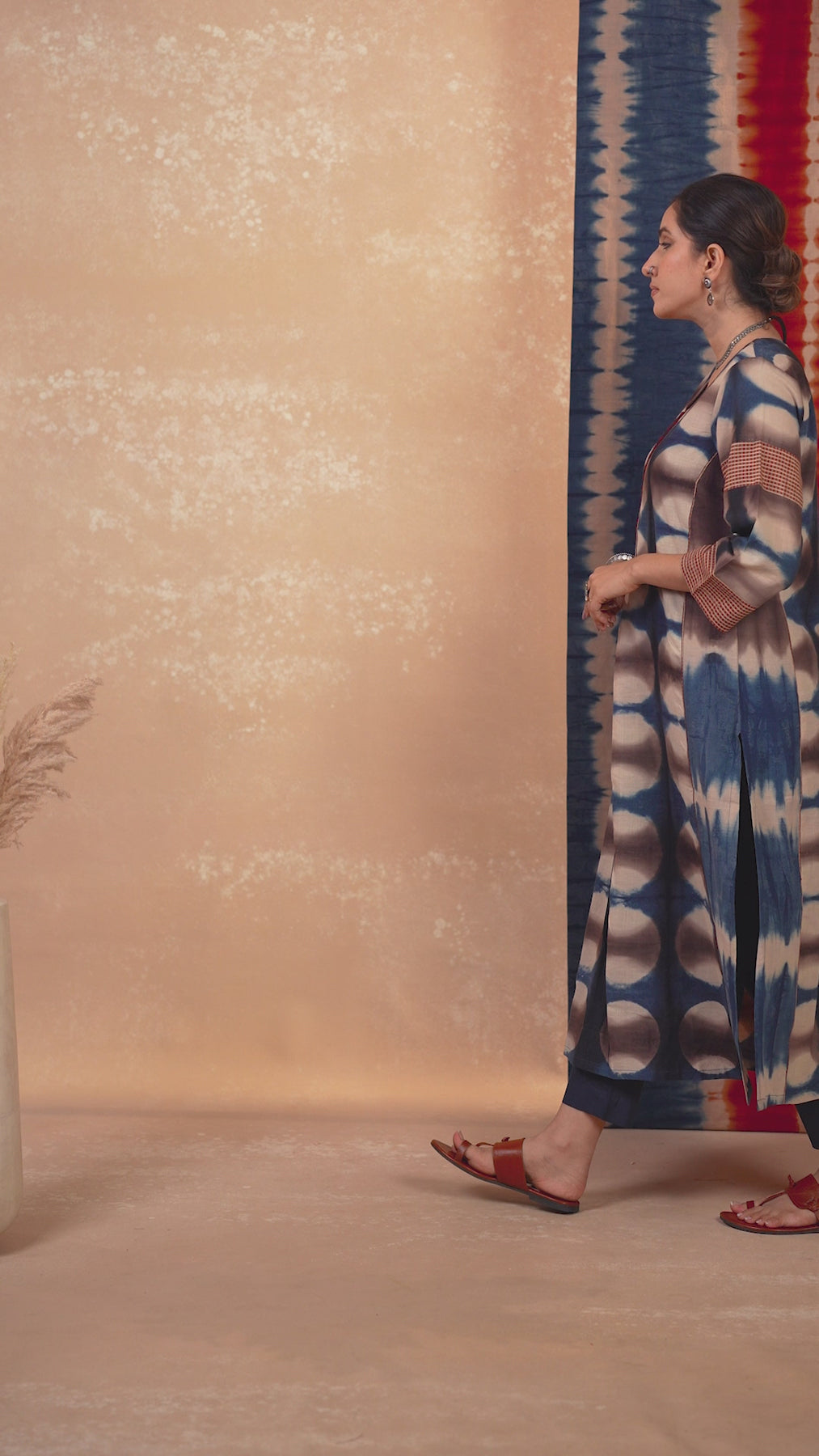 Experience the richness of this cotton kurta, where the clamp technique reveals subtle variations in tones of blue and rust, adding captivating depth to the fabric. Each fold and pattern showcases a unique interplay of shades, creating a dynamic visual effect that draws the eye. This thoughtful blend of colours makes the kurta versatile for any occasion.
