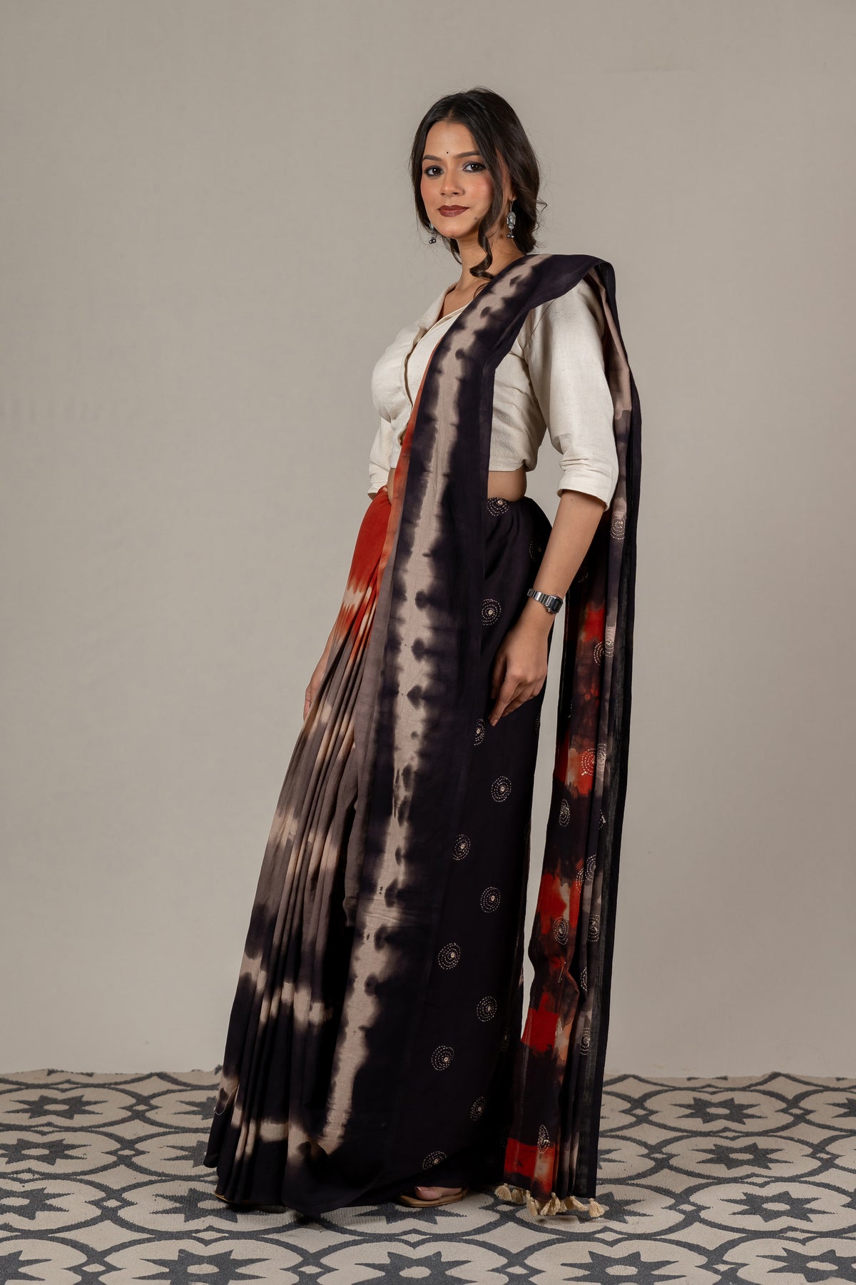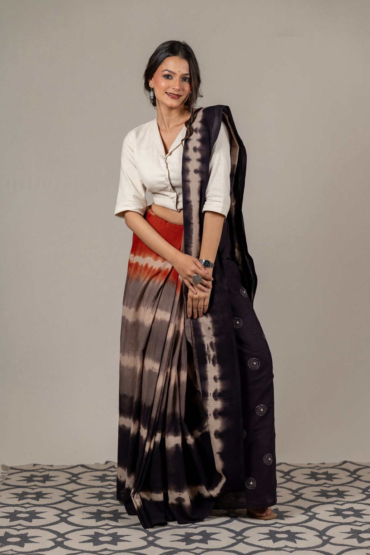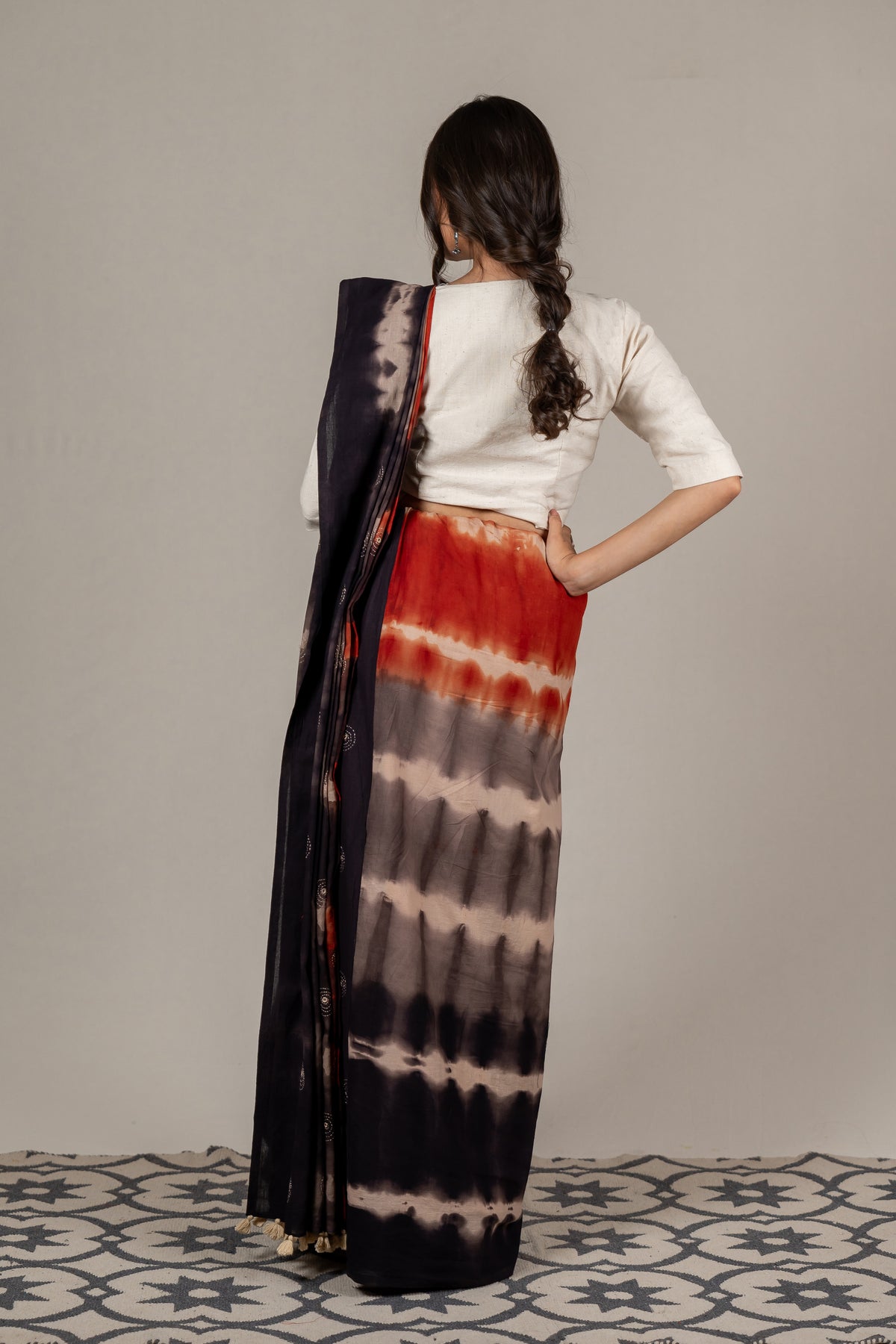 Hand-Tied Shibori Saree in Brown and Rustic Red – Sama