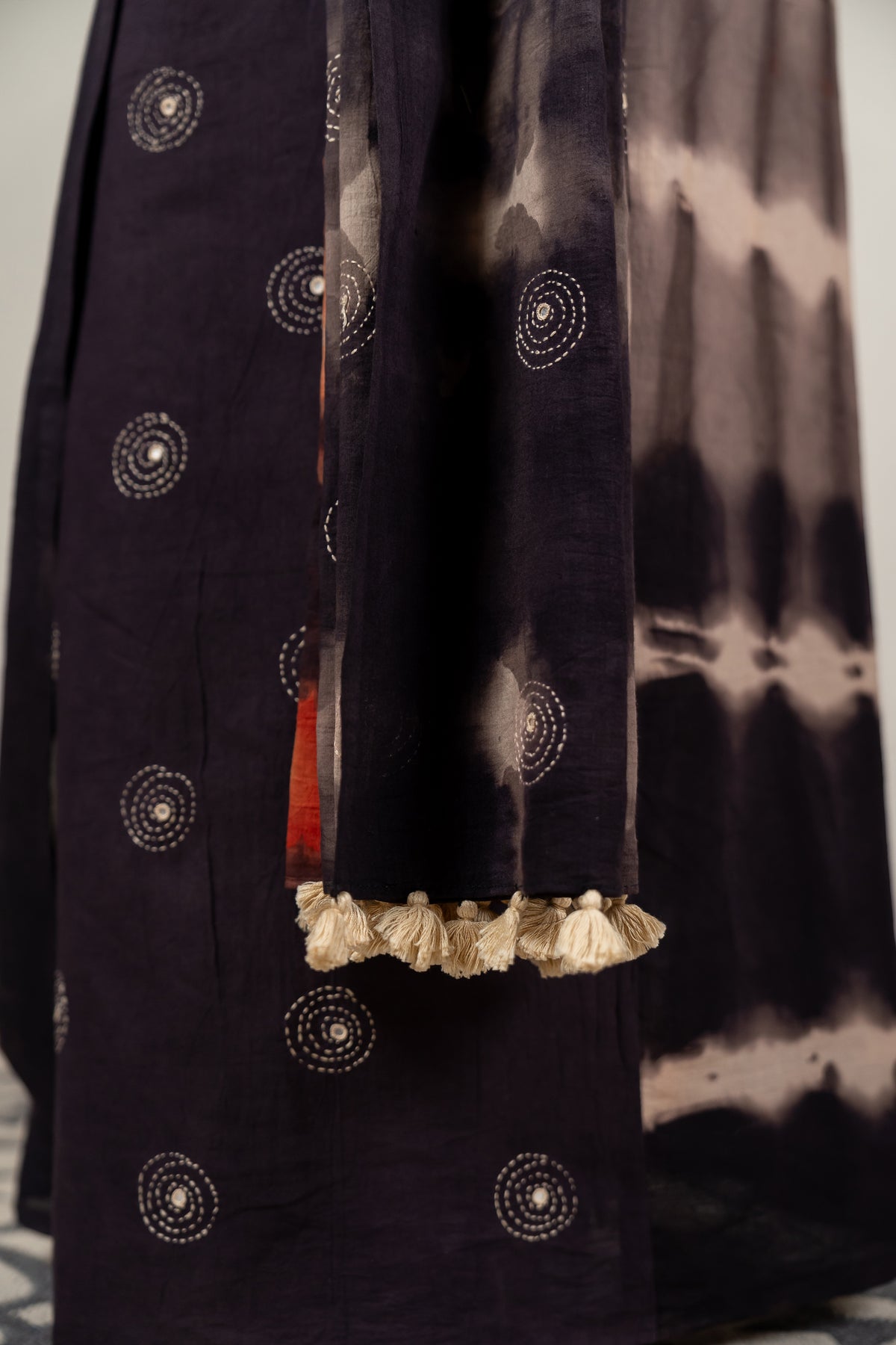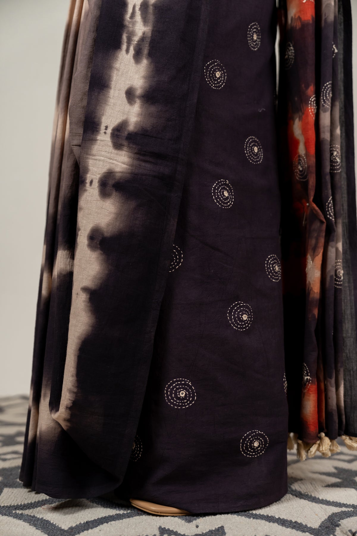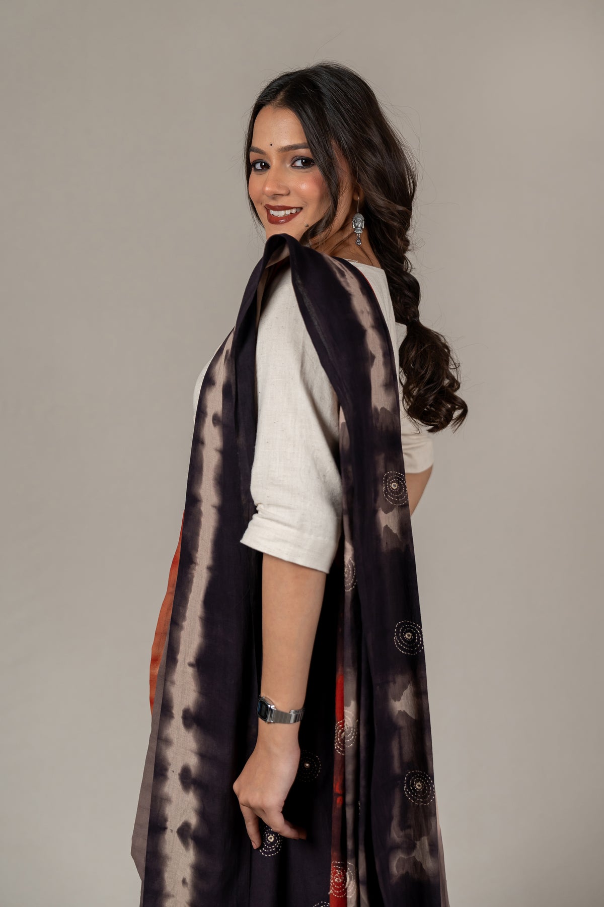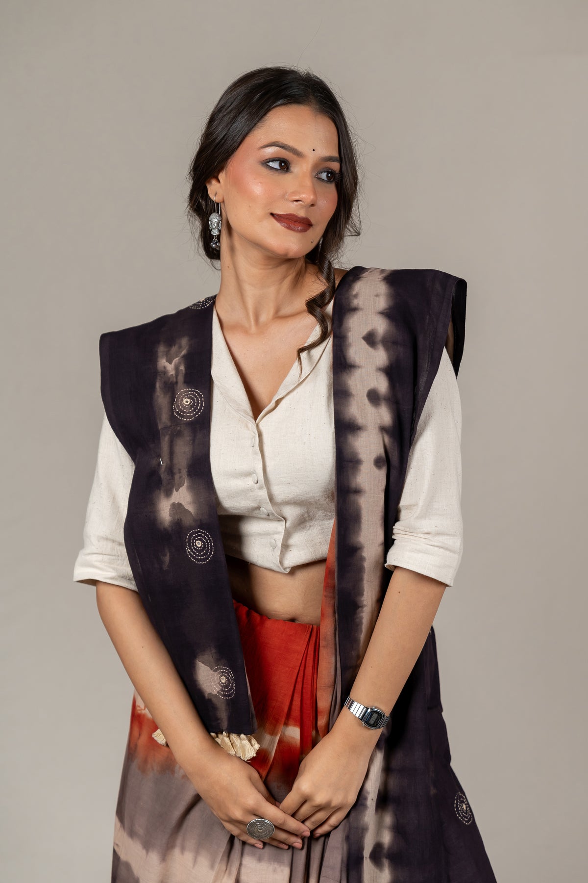 This hand-tied Shibori saree stands out for its distinct folds, beautifully dyed in earthy brown and rustic red hues. Accentuated with delicate running stitches and mirror details, it reflects the essence of handcrafted artistry.