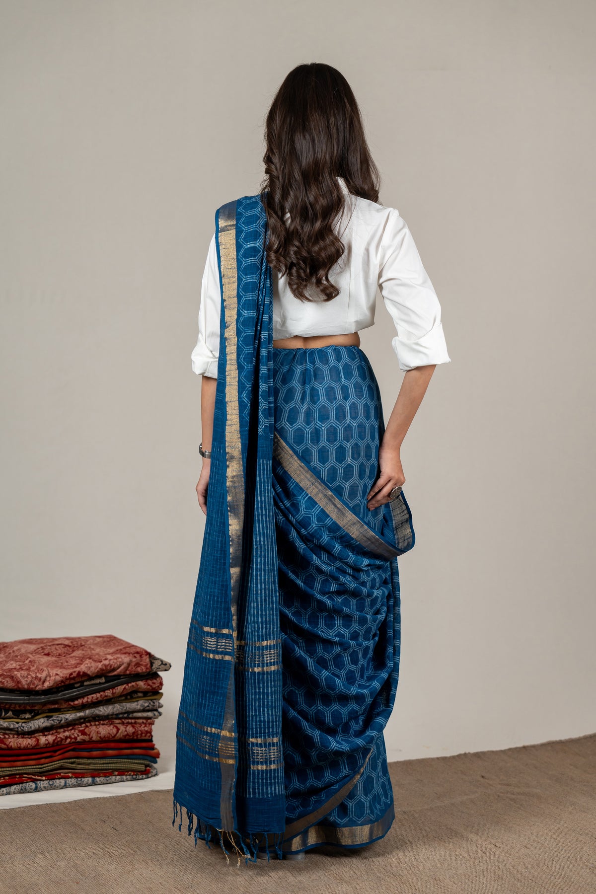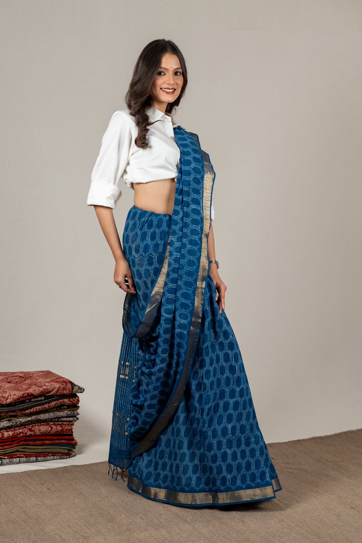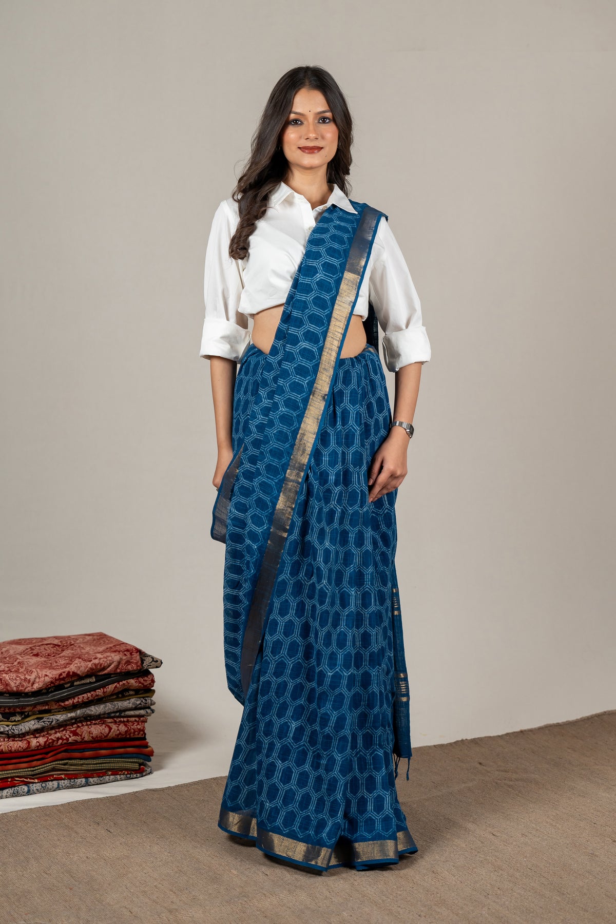 Indigo Chanderi Dabu Hand Block Printed Saree – Sama