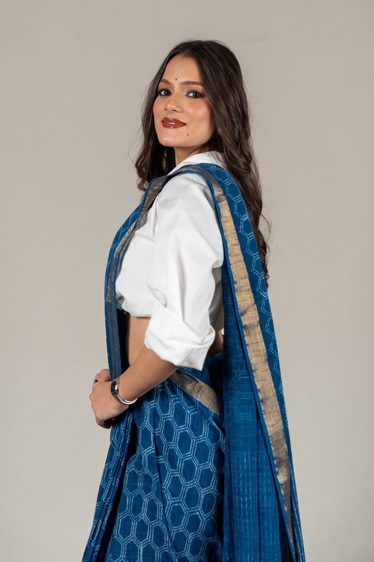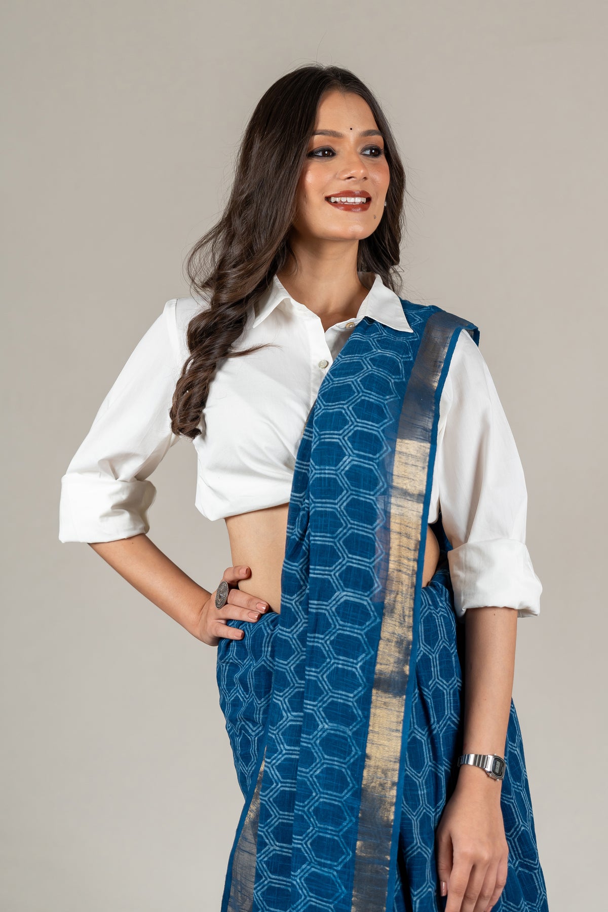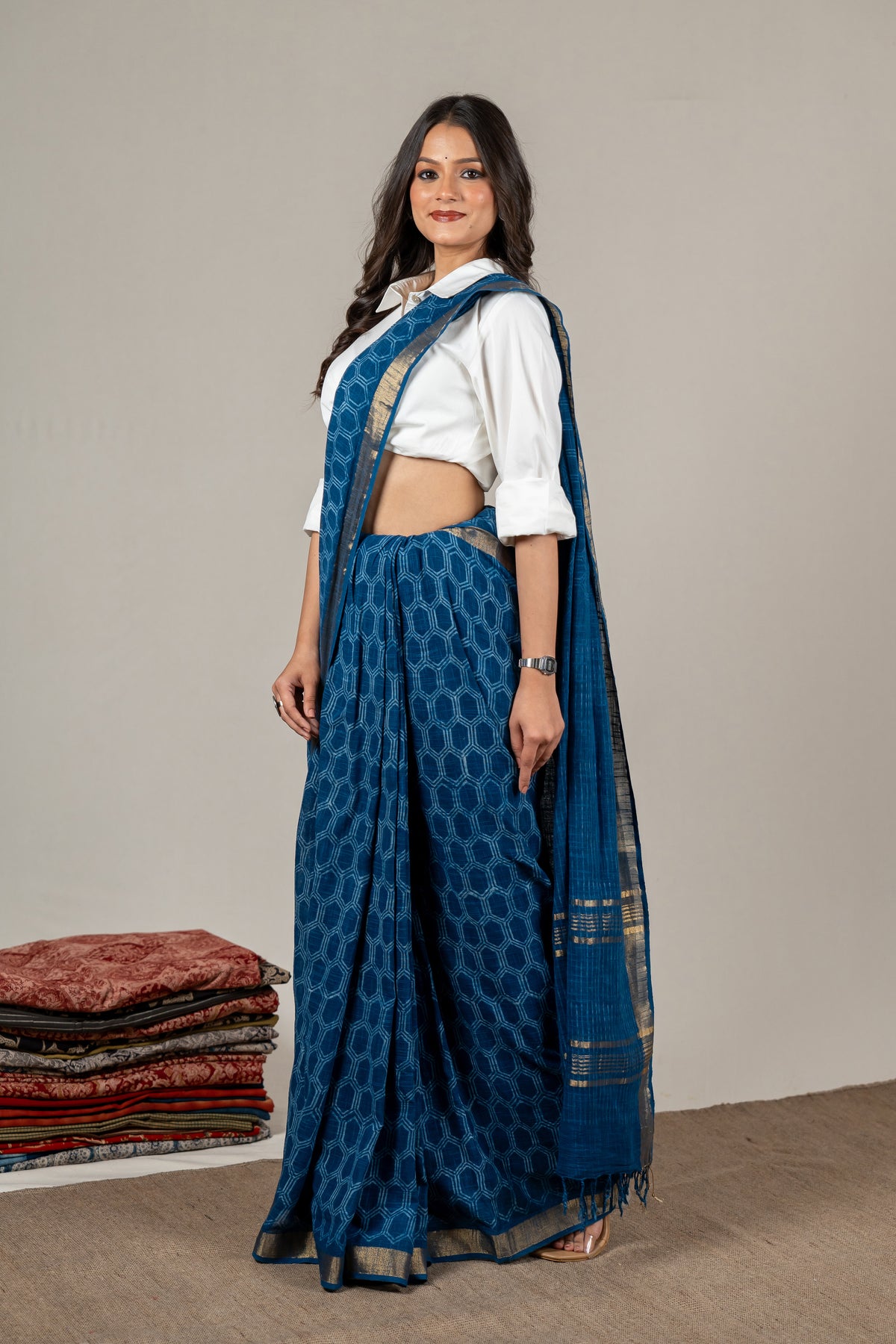 Indigo Chanderi Dabu Hand Block Printed Saree – Sama