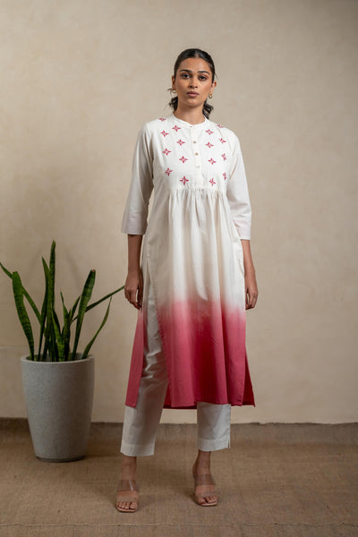 An interplay of colour and craft, this ombré tie-dye kurta is a celebration of soft transitions and delicate embroidery. With its flowing silhouette and stylish cuffs, it’s made for days when you want a touch of elegance without effort.