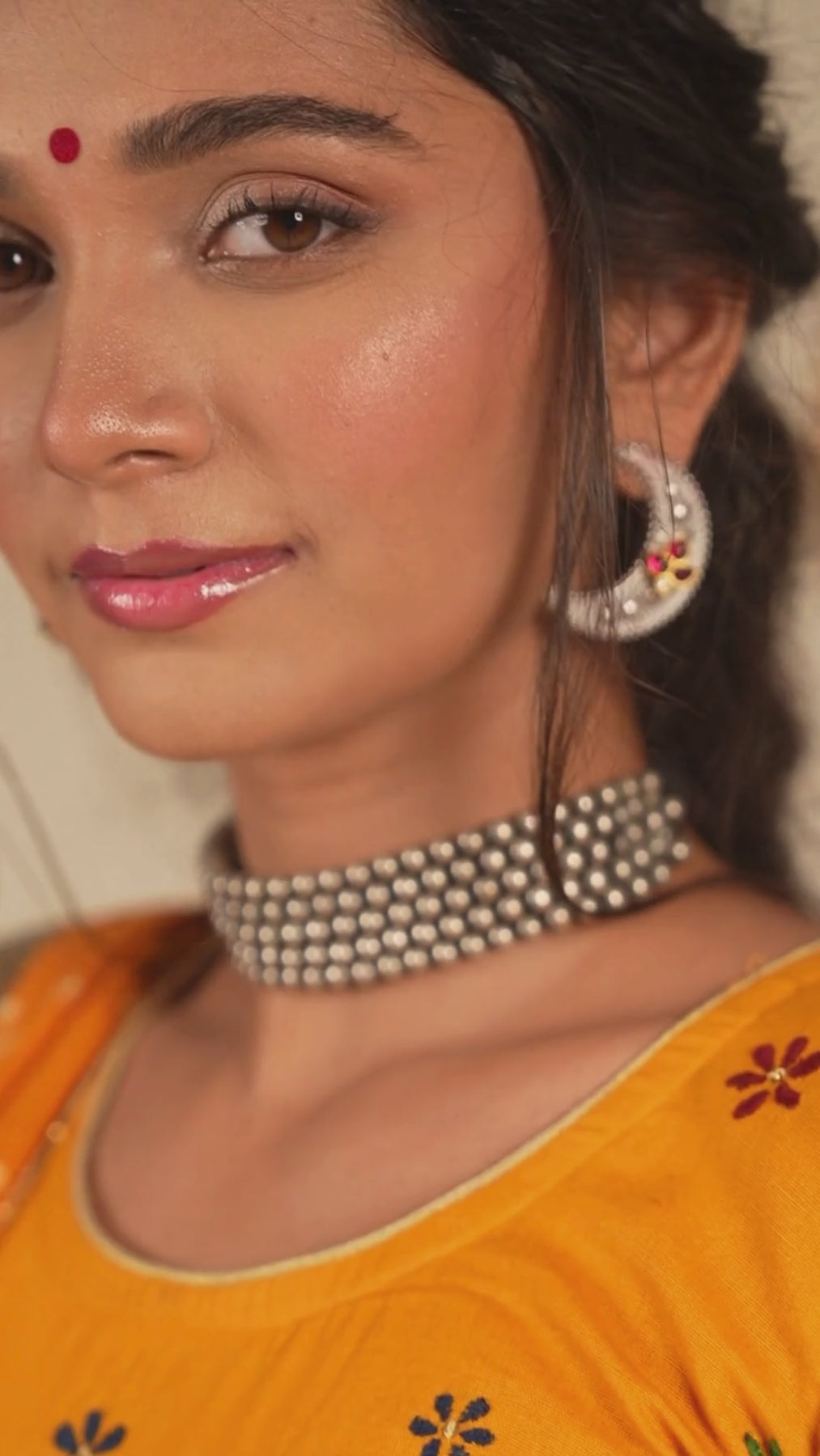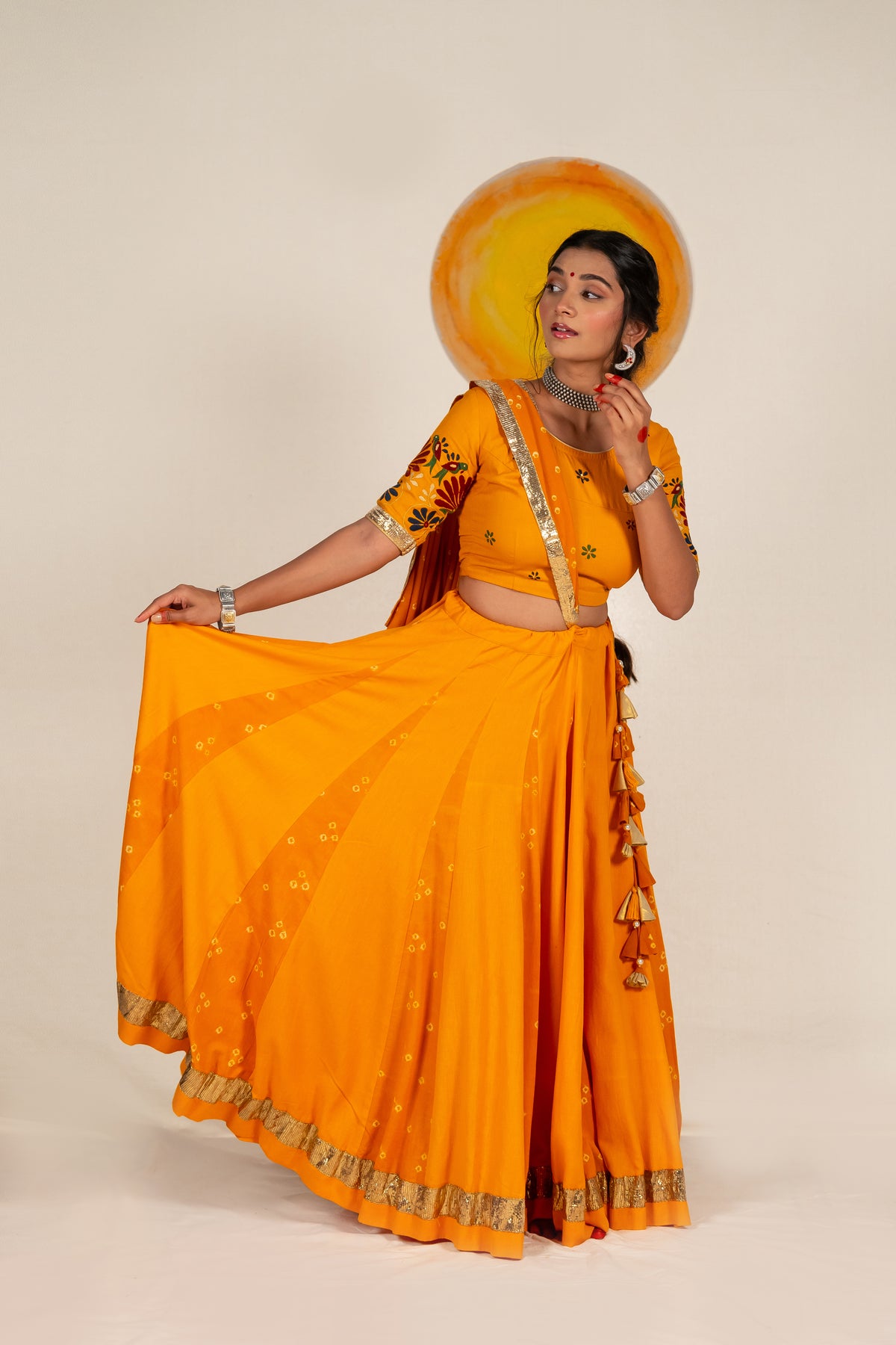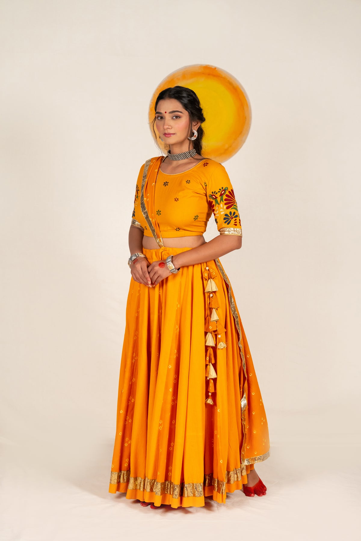 A matching cotton blouse embellished with hand-embroidered floral motifs across the sleeves and body. The artisanal detailing enhances the vibrance and charm of the ensemble.