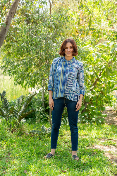 Breezy, bright and beautifully block-printed in blue! This summer shirt is cut in a relaxed fit with a playful interplay of florals and stripes. Designed with an up-down hemline with side slit for added movement, this stylish and fresh shirt is best-suited for warm days and easy layering.