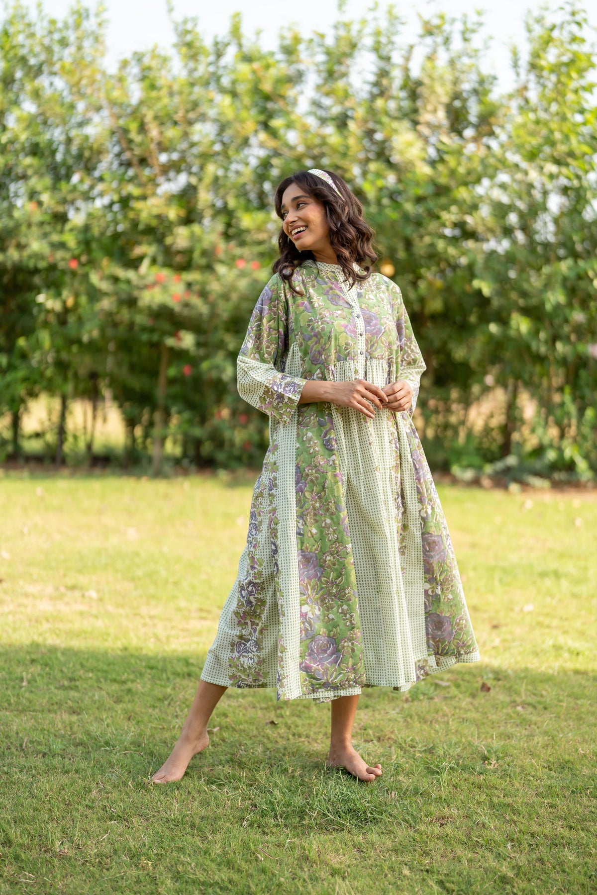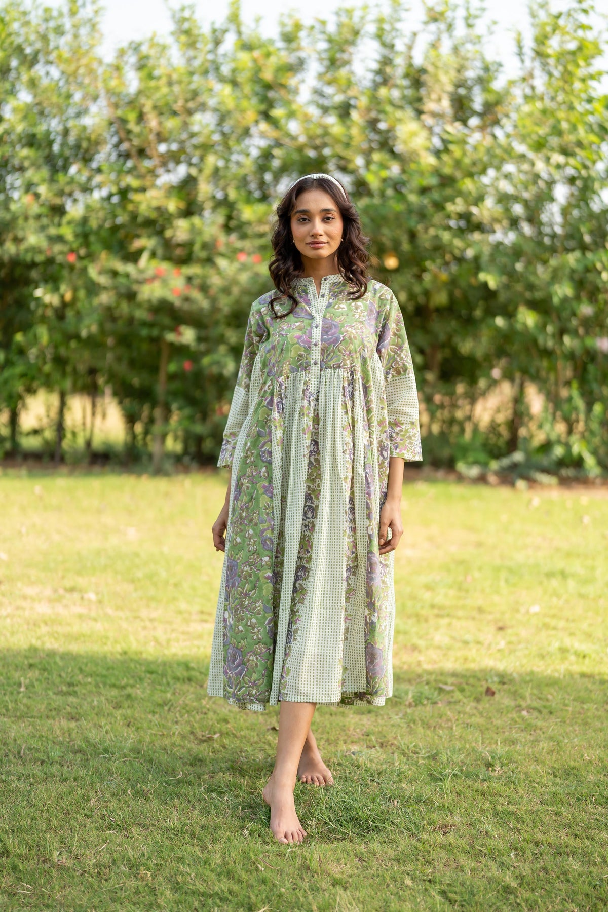 The perfect green summer dress with a full-flare and panels to give the shape a subtle structure. This floral Ray-ethnic dress features a band collar and button placket. The structured yoke transitions into soft gather at the waste, adding volume and graceful movement to the flared silhouette flows.