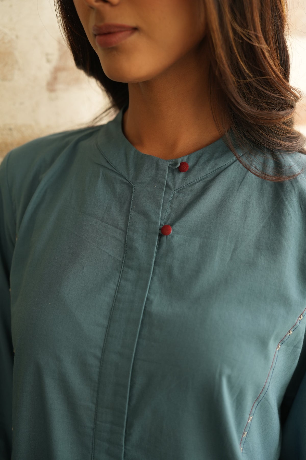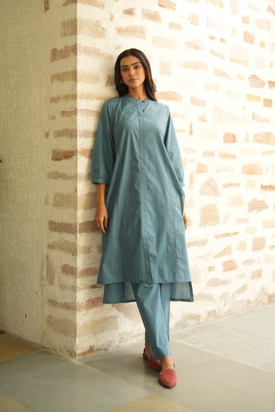Ash blue pure cotton kurta with detailed handwork on the princess line. Features a band collar, buttoned placket, and contrast buttons for a sharp finish.