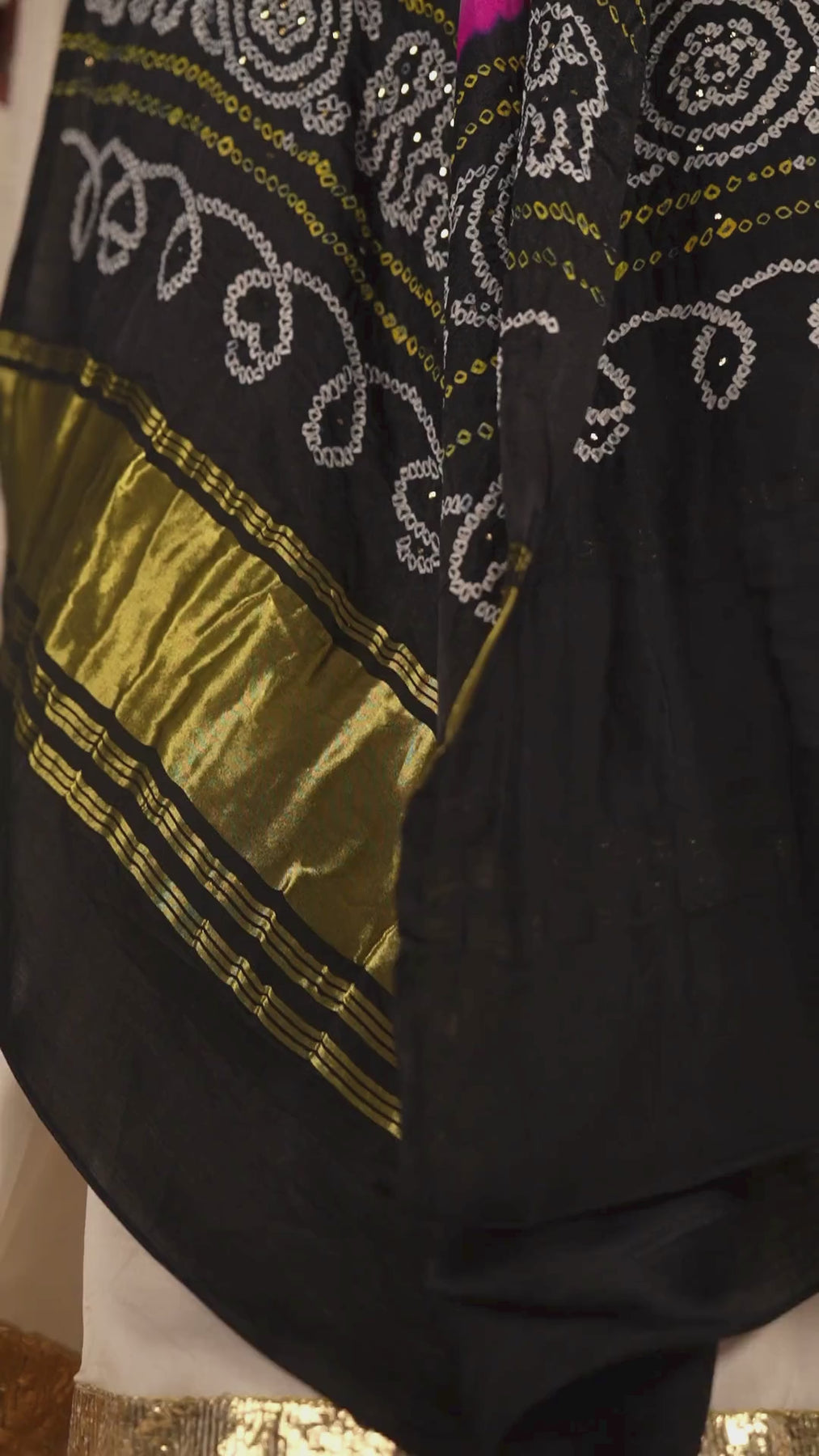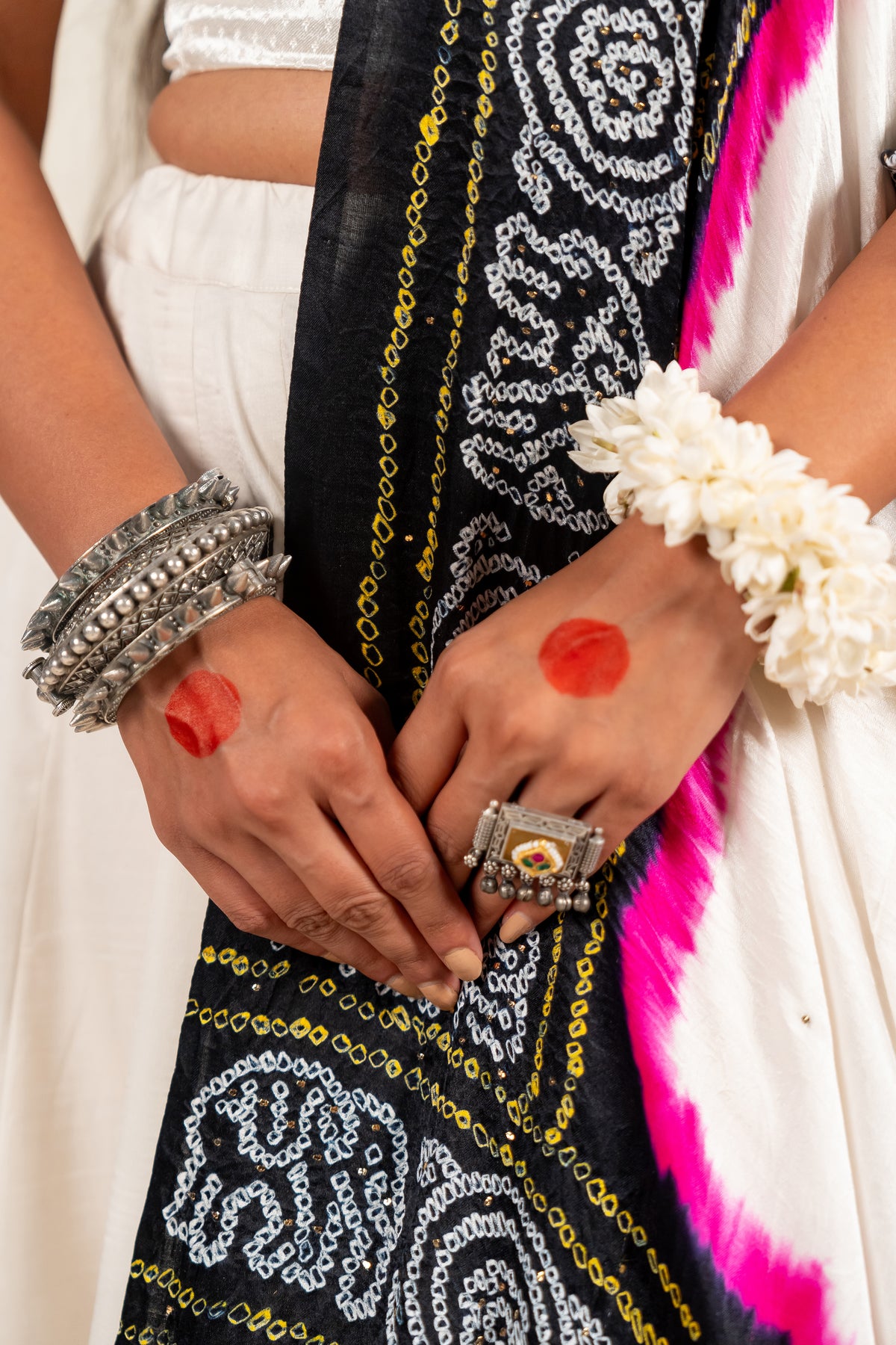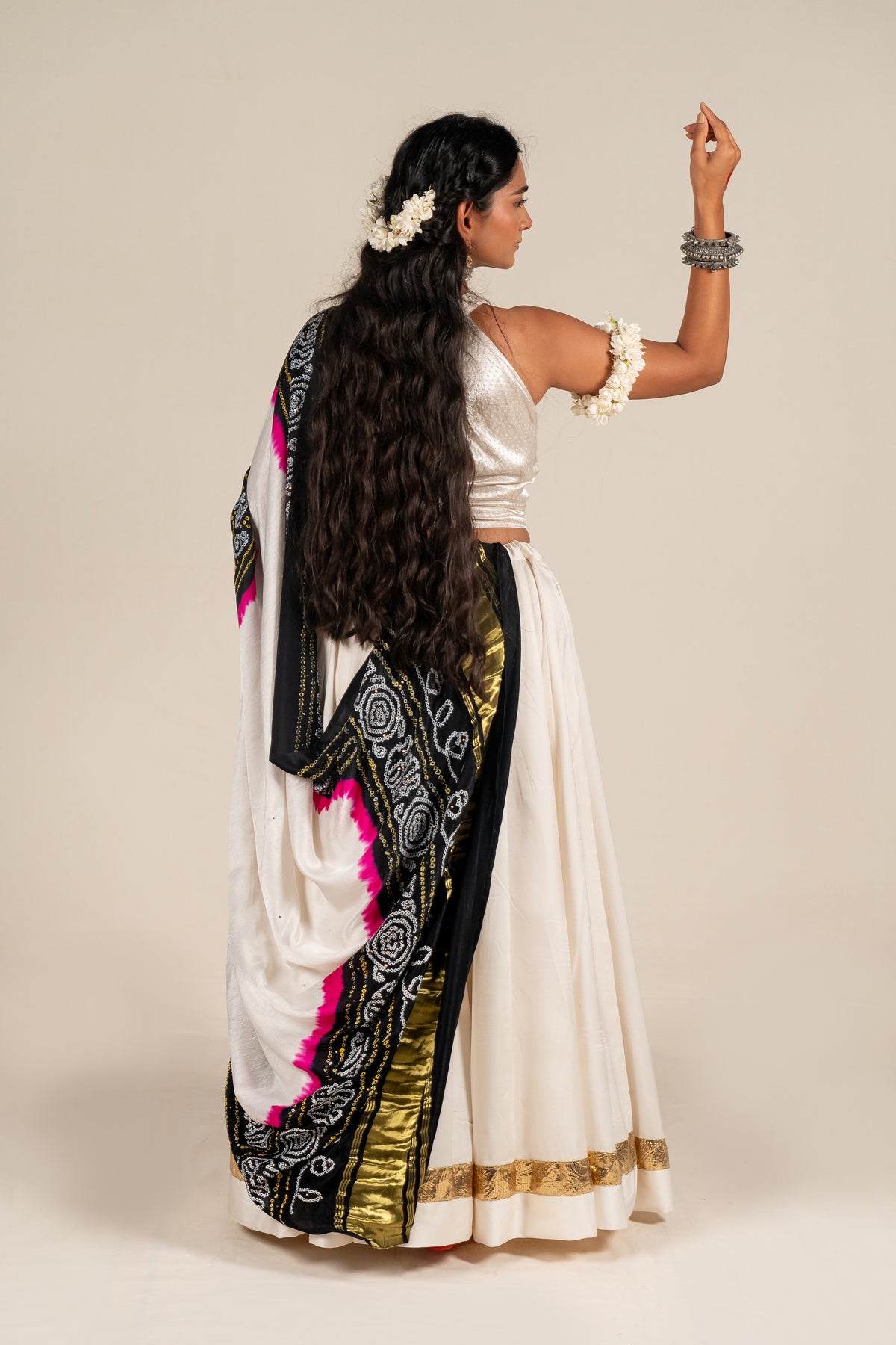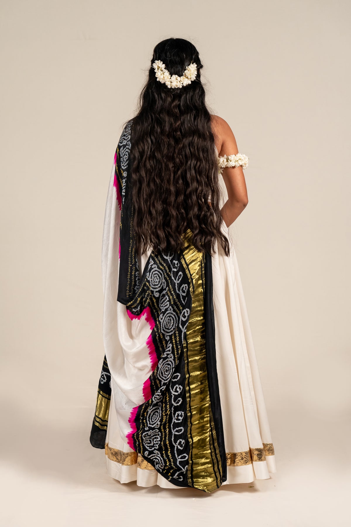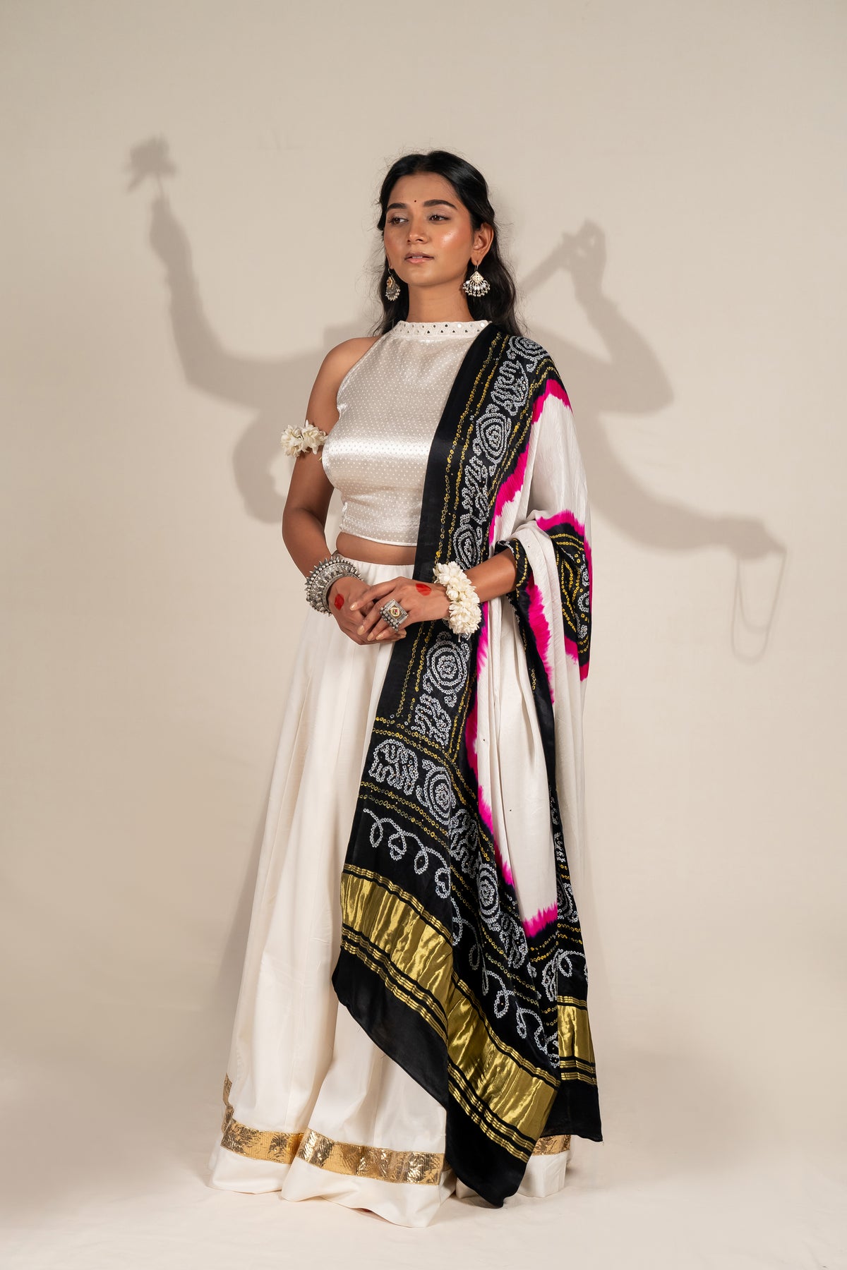 A rich gaji silk bandhej dupatta, patterned with traditional tie-dye motifs. The white and pink center is framed with bold black and golden bands, creating a vivid play of color and texture. Embliehsed with Badla work.