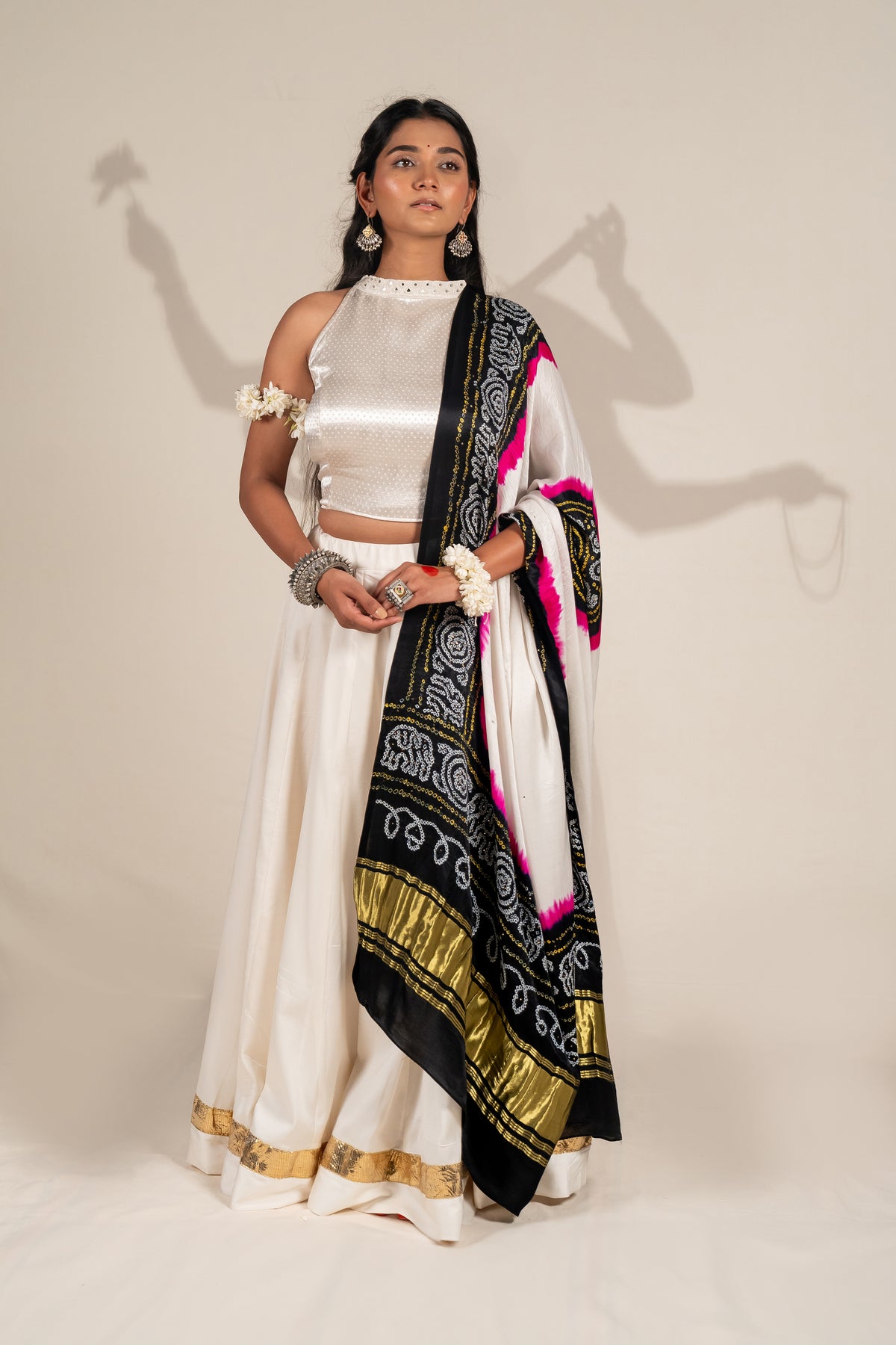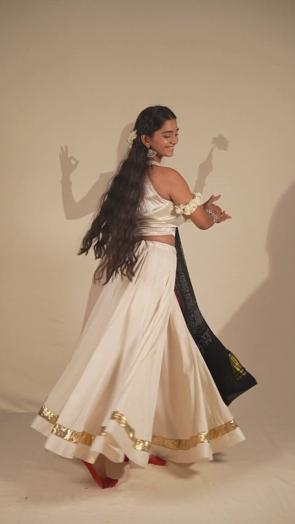 A flared modal skirt in off-white, highlighted with a shimmering golden lumbi border at the hem. The soft fall of the fabric and tassel tie-up lend it movement and festive grace.