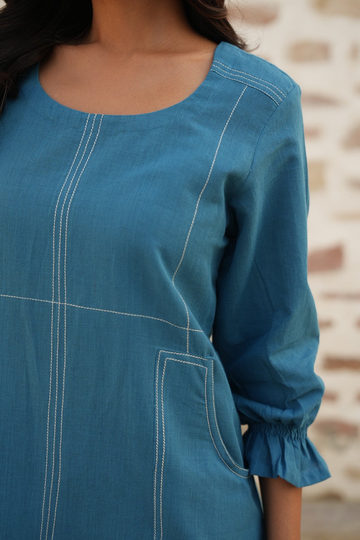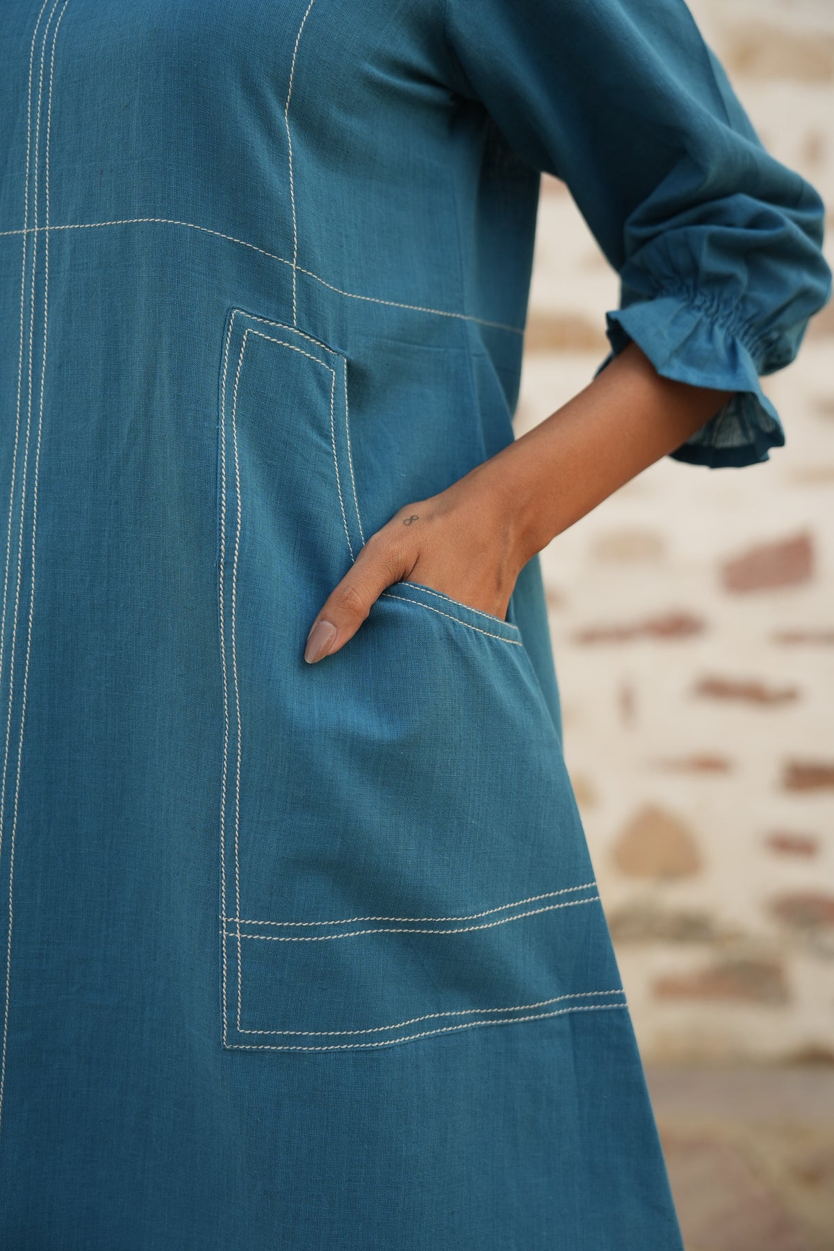 Made in handloom cotton, this blue dress features a patch pocket, elasticated sleeves, and stitch detailing for a relaxed and modern feel.