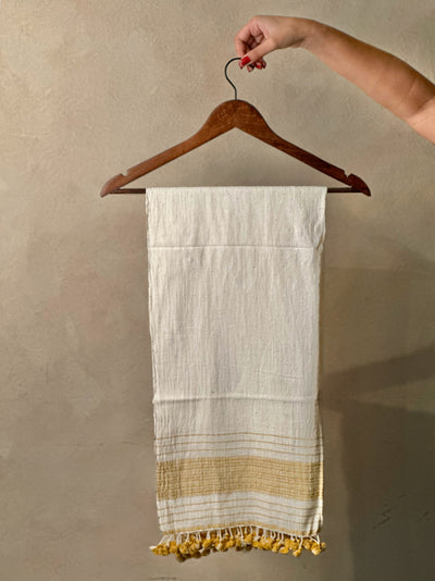 Handwoven on traditional looms, this off-white stole with mustard yellow border carries timeless elegance. A subtle yet classic piece to elevate casual ensembles.