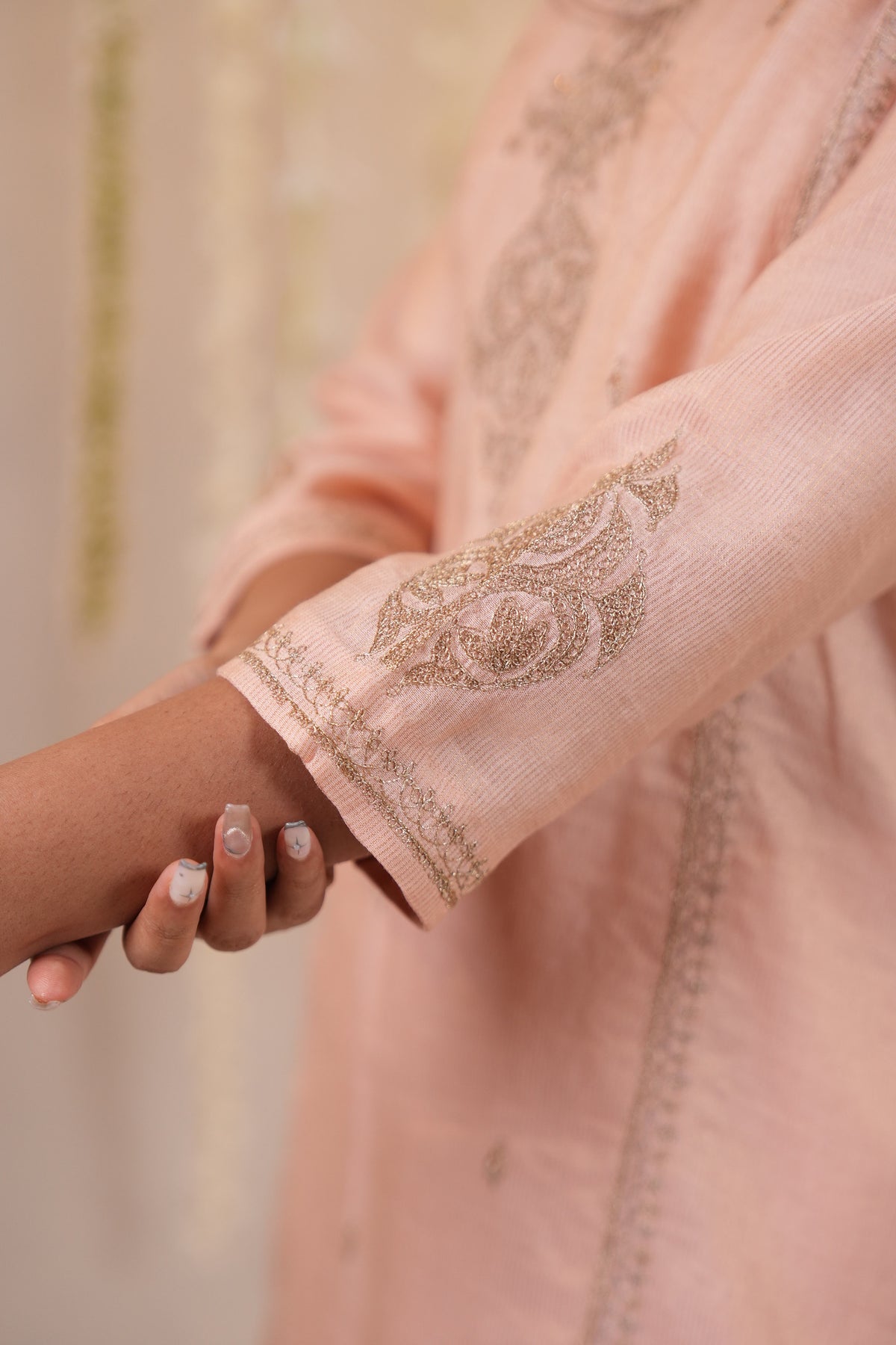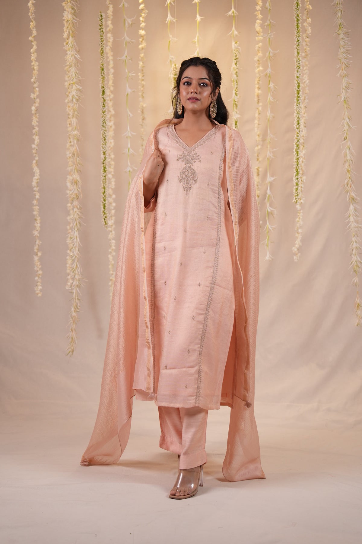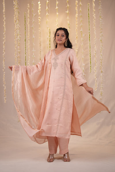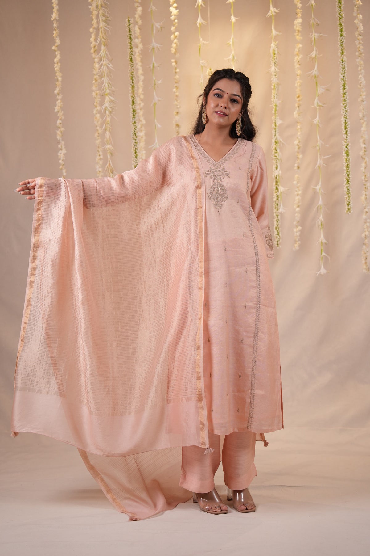 A stylish three piece set featuring a striped tissue silk kurta with delicate embroidery detailing. Paired with cotton silk pants and a Chanderi dupatta featuring all-over stripe detailing, this ensemble brings together subtle texture and elegant design.