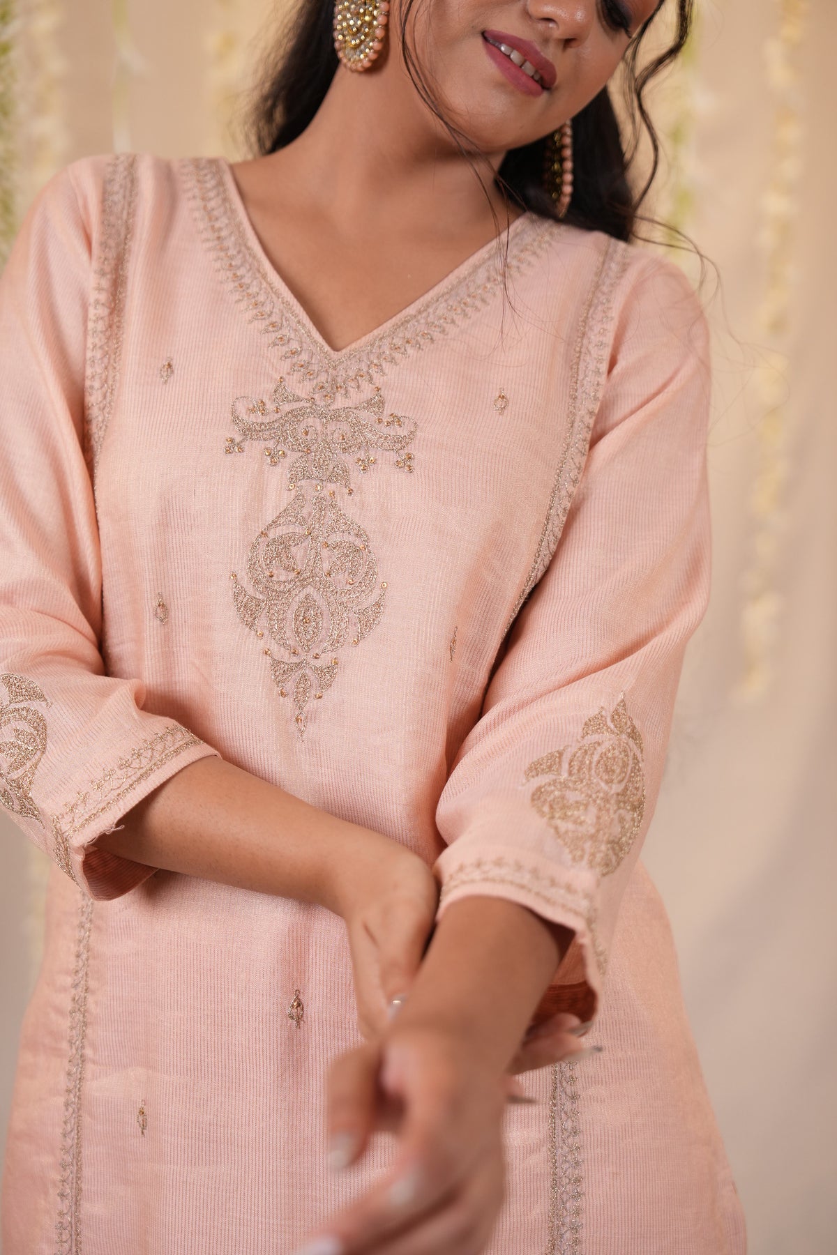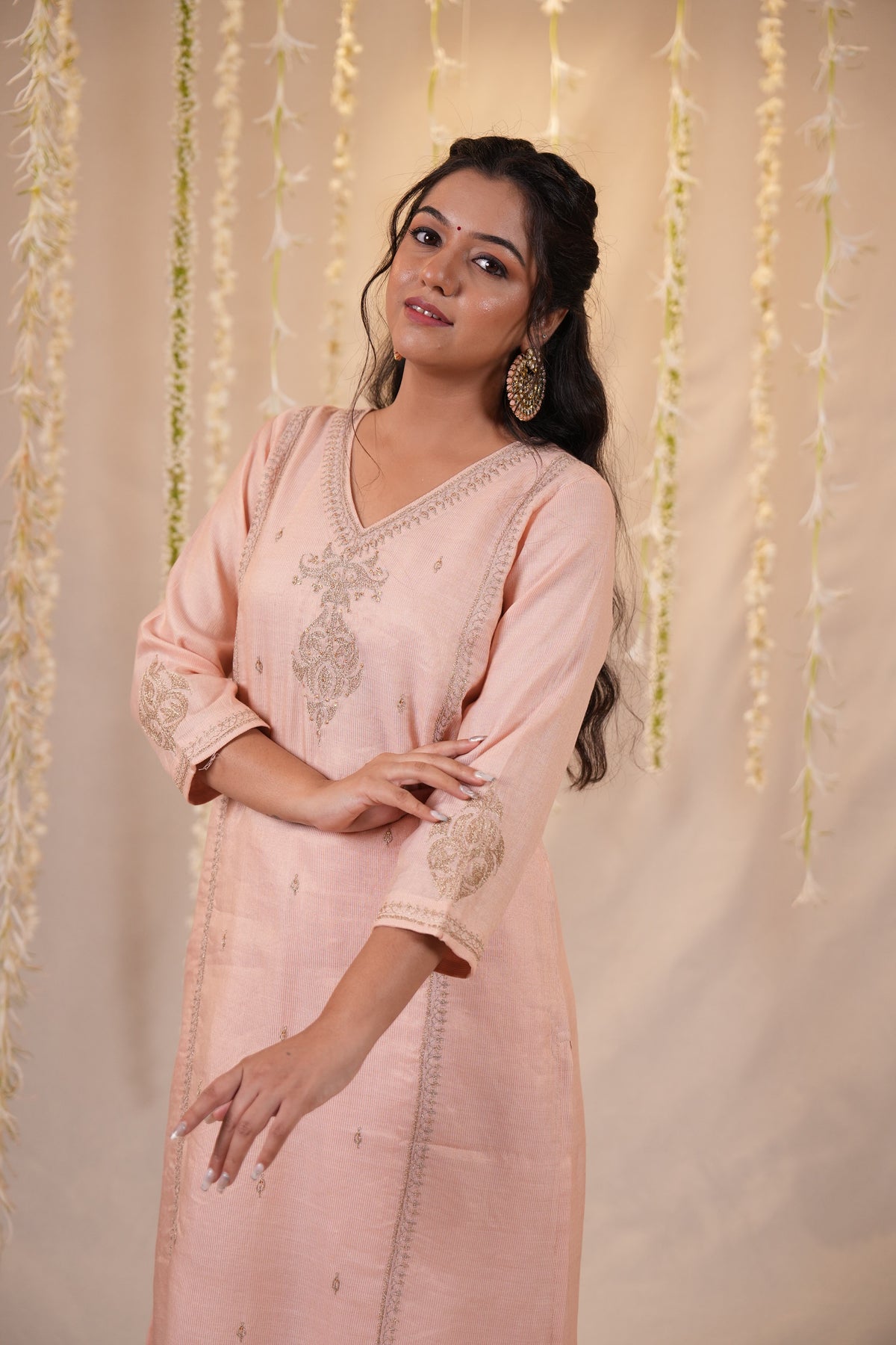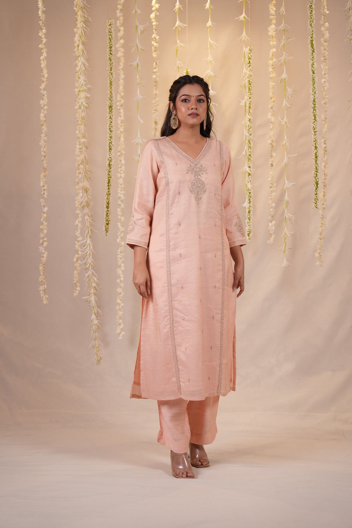 A stylish three piece set featuring a striped tissue silk kurta with delicate embroidery detailing. Paired with cotton silk pants and a Chanderi dupatta featuring all-over stripe detailing, this ensemble brings together subtle texture and elegant design.