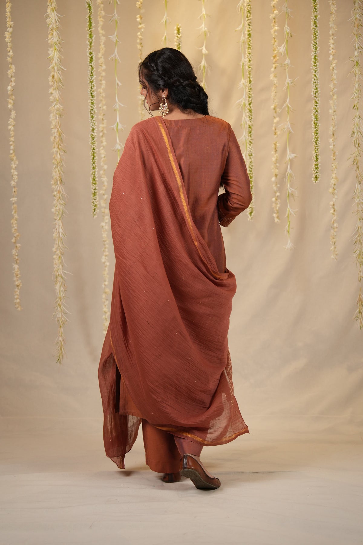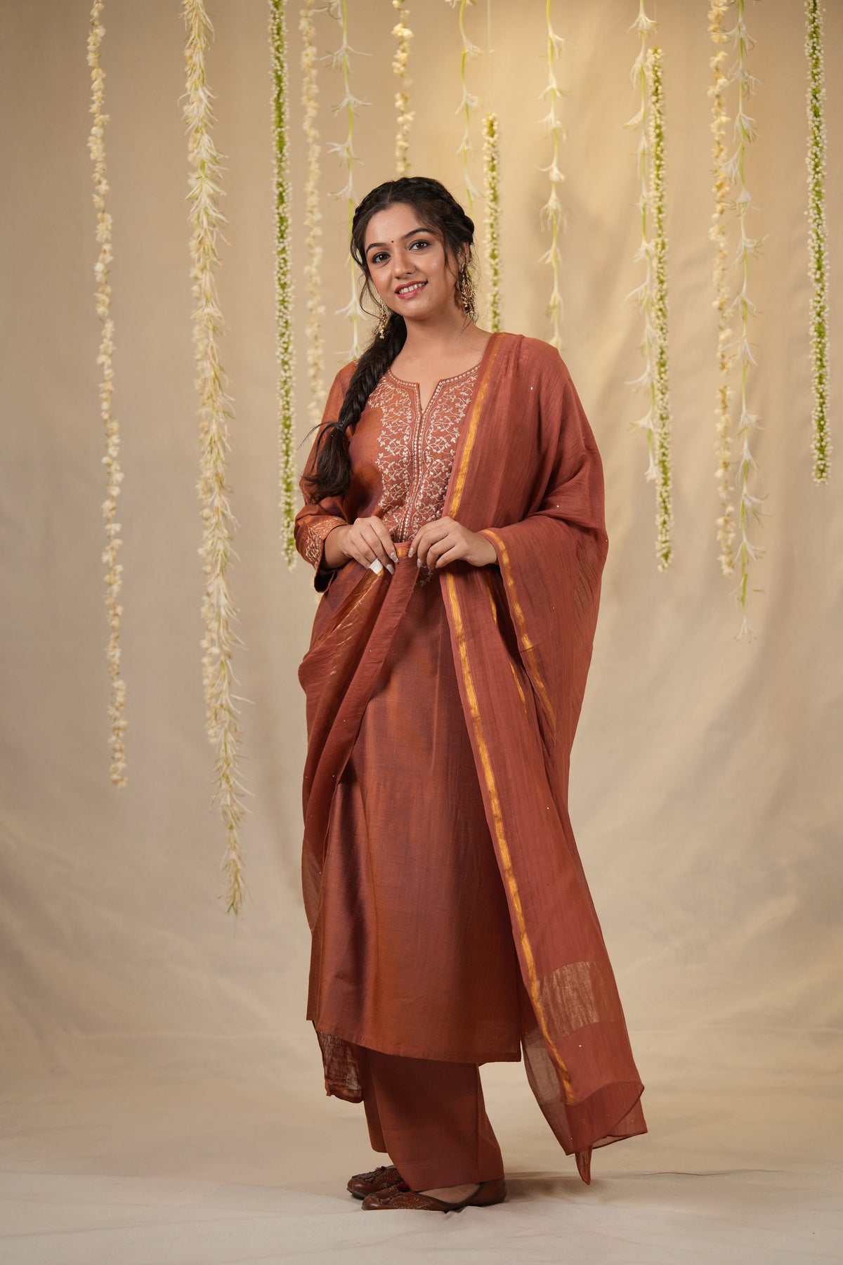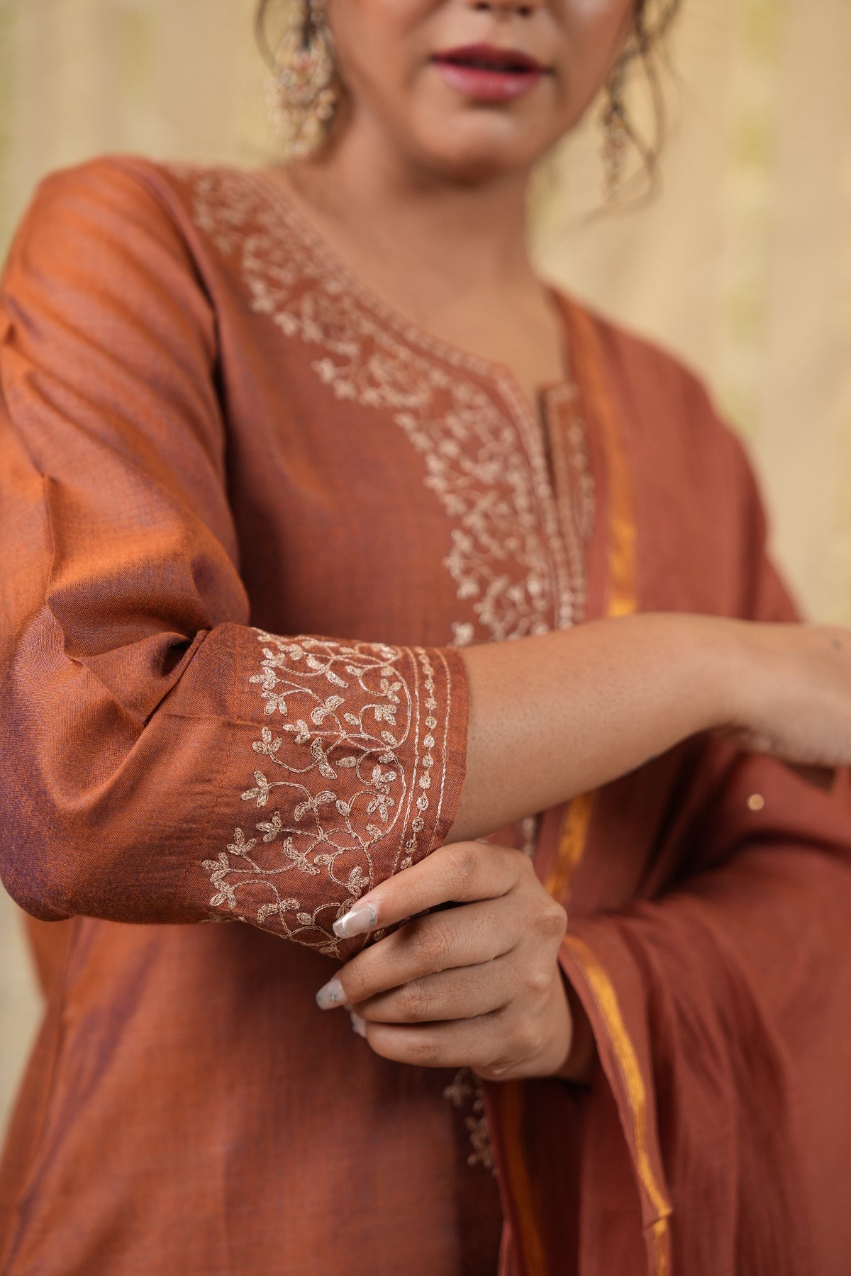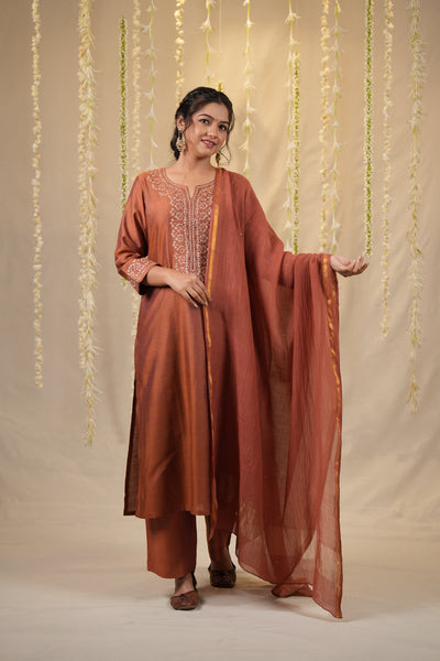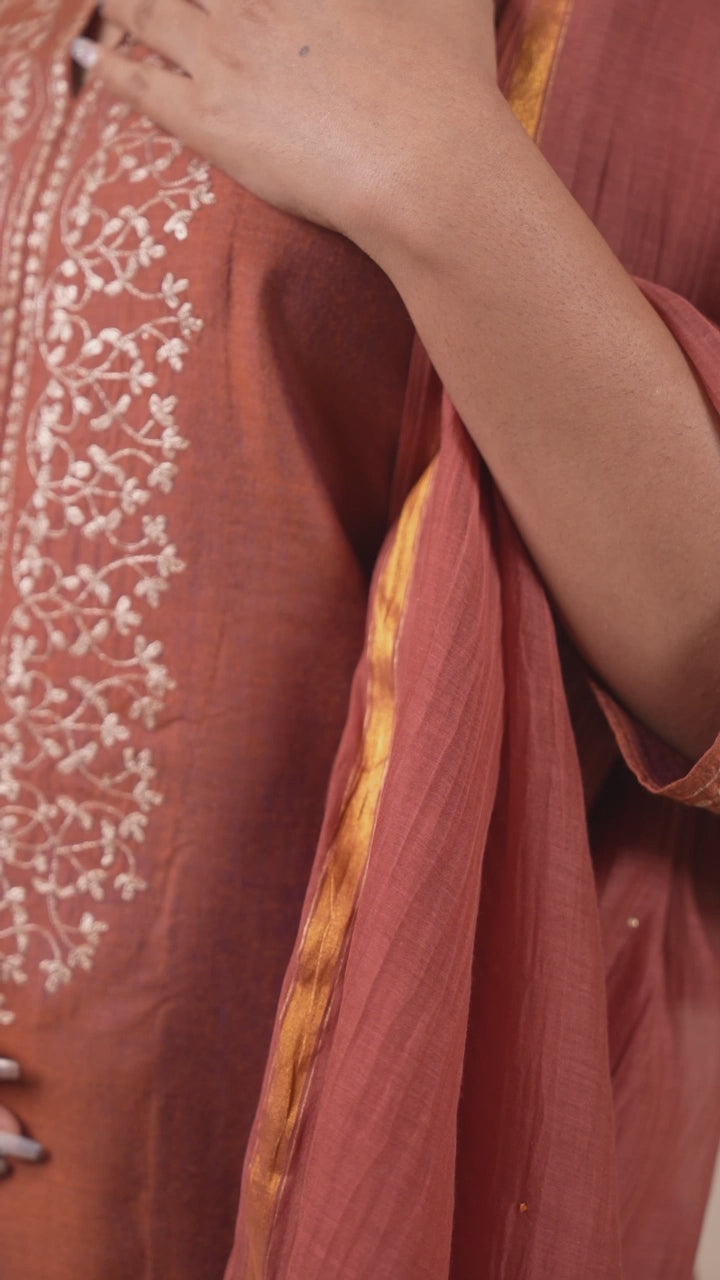 A graceful three piece set in an elegant rust hue, featuring a cotton silk kurta with intricate embroidery on the yoke and sleeves. Paired with matching cotton silk pants and a Chanderi dupatta adorned with delicate baadla work, this ensemble is perfect for understated festive elegance.