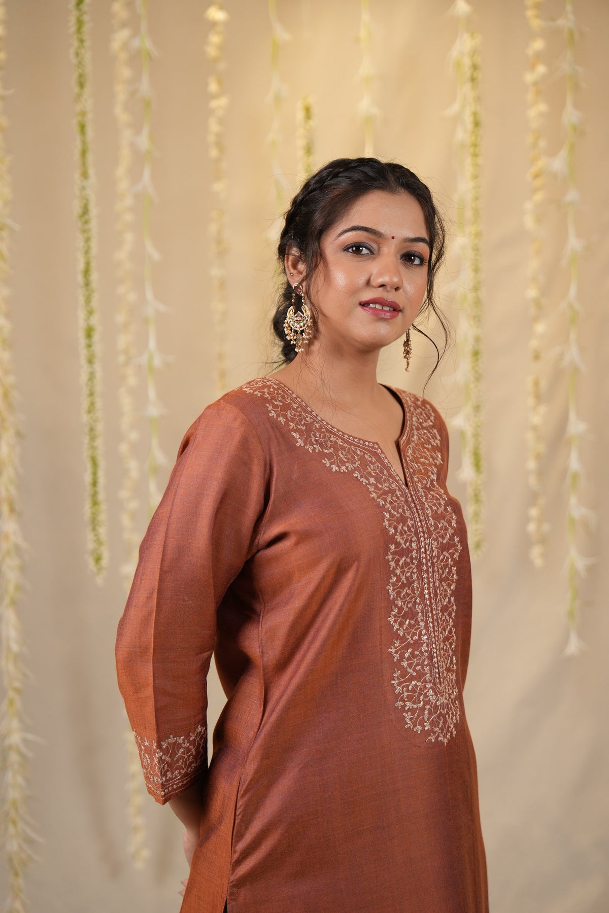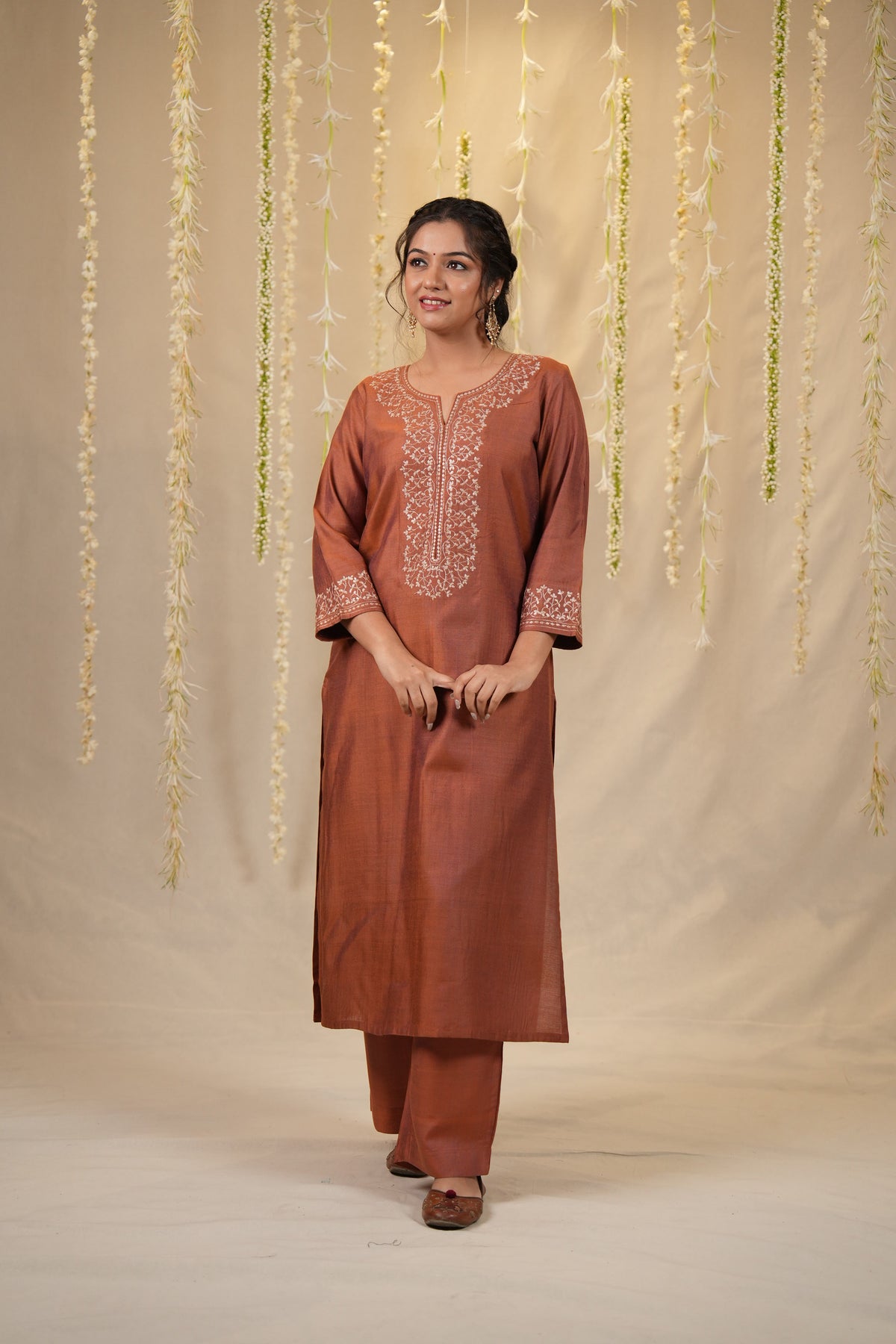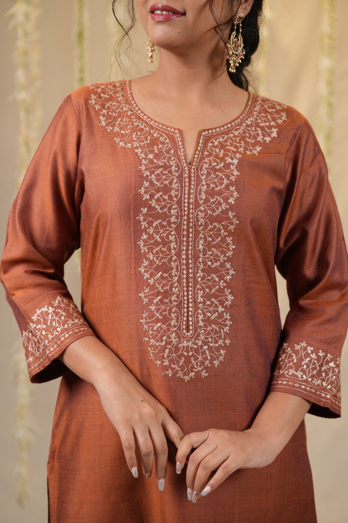A graceful three piece set in an elegant rust hue, featuring a cotton silk kurta with intricate embroidery on the yoke and sleeves. Paired with matching cotton silk pants and a Chanderi dupatta adorned with delicate baadla work, this ensemble is perfect for understated festive elegance.