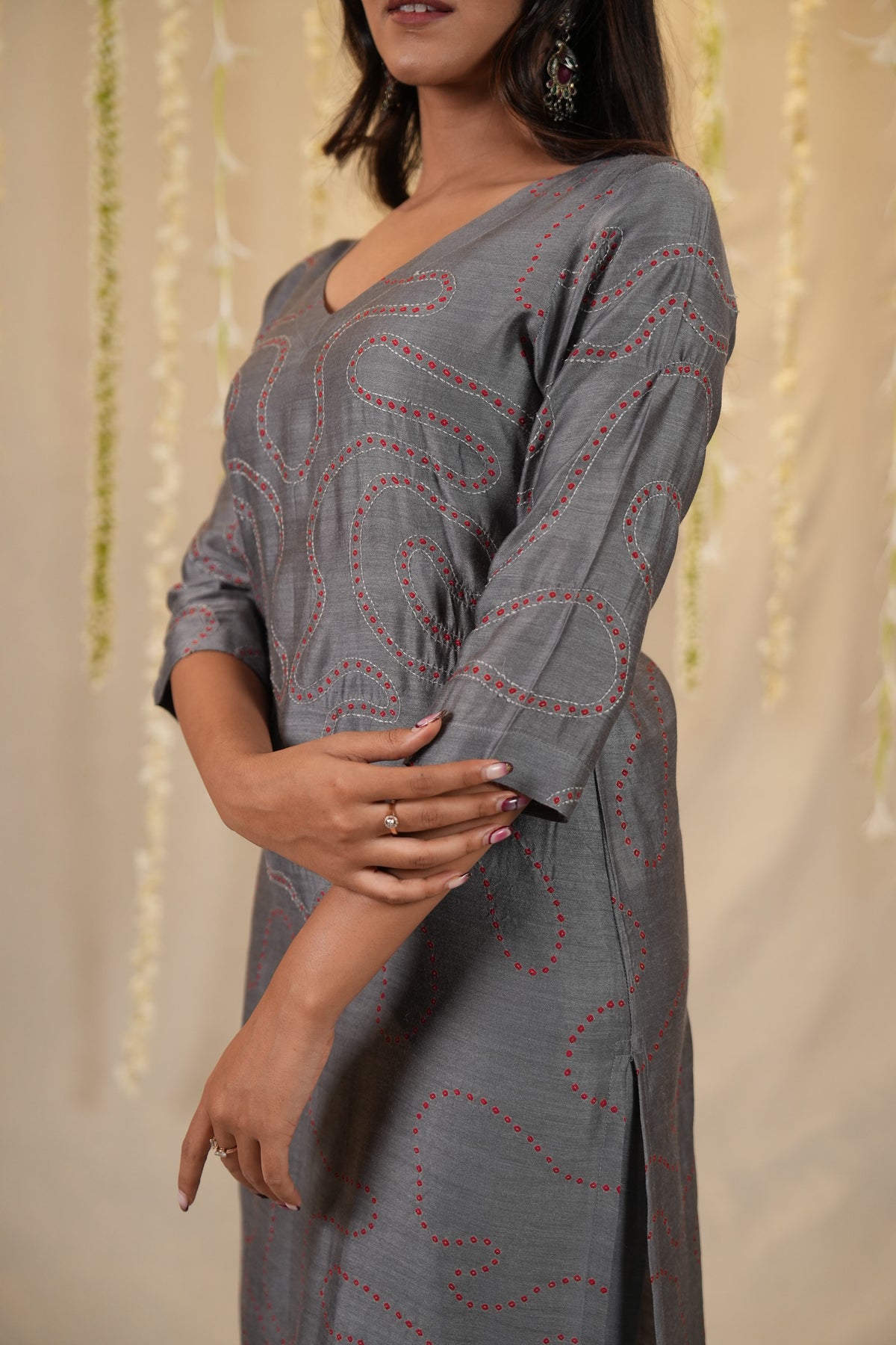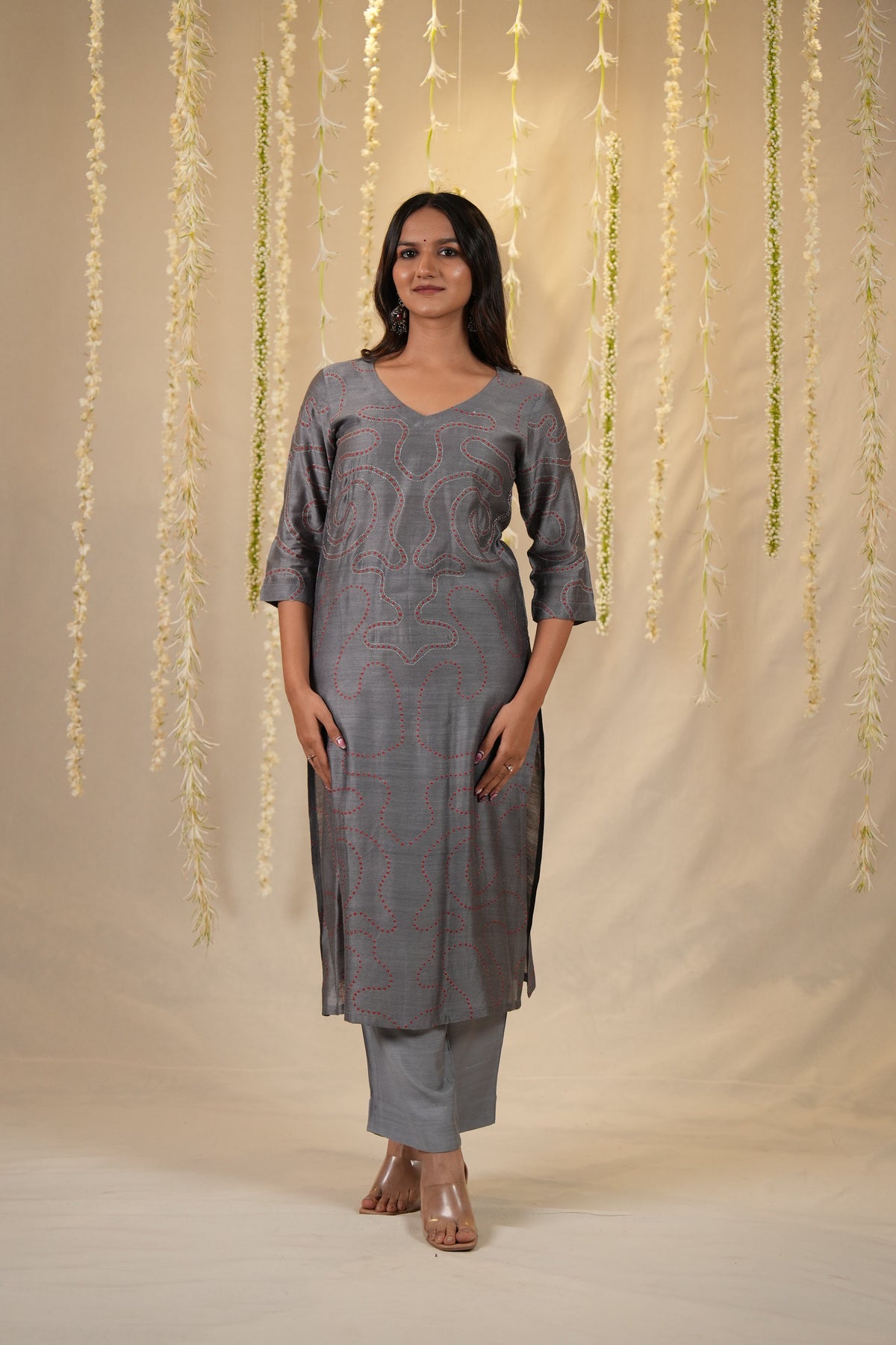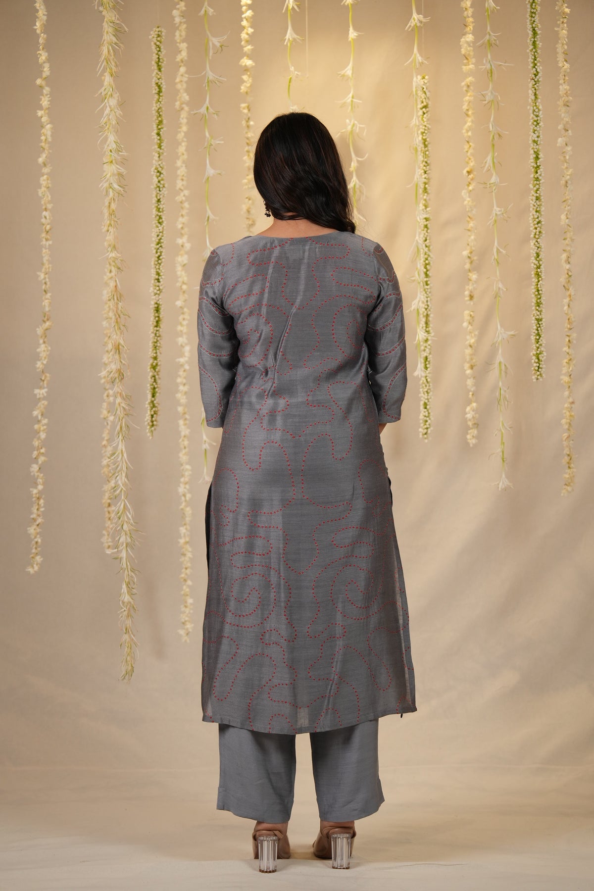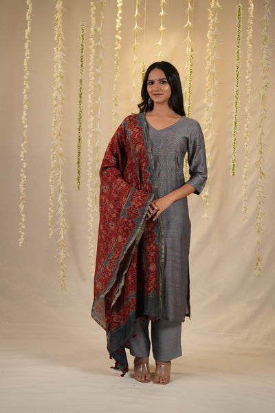 A striking two piece set Bandhej kurta featuring an abstract all-over design with red Muga silk Bandhani kurta daanas on a classic Grey base, enhanced with subtle hand embroidery detailing. Paired with a cotton silk pant for a complete look. You can style it with a vibrant dupatta—such as a Timeless Chanderi Ajrakh dupatta or a similar artistic piece. (Dupatta are not included; styling suggestions only).