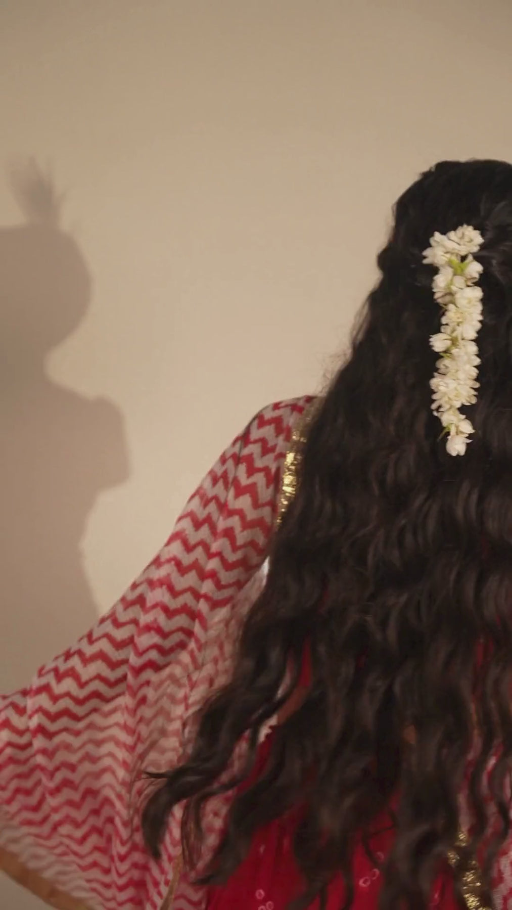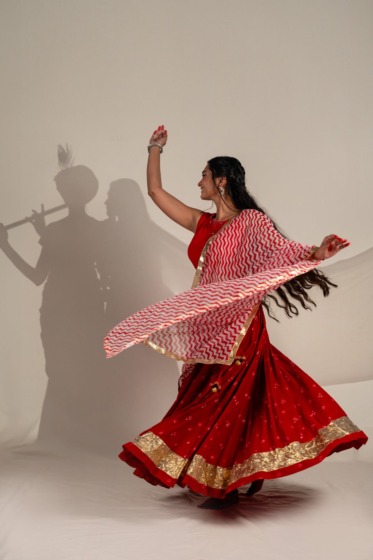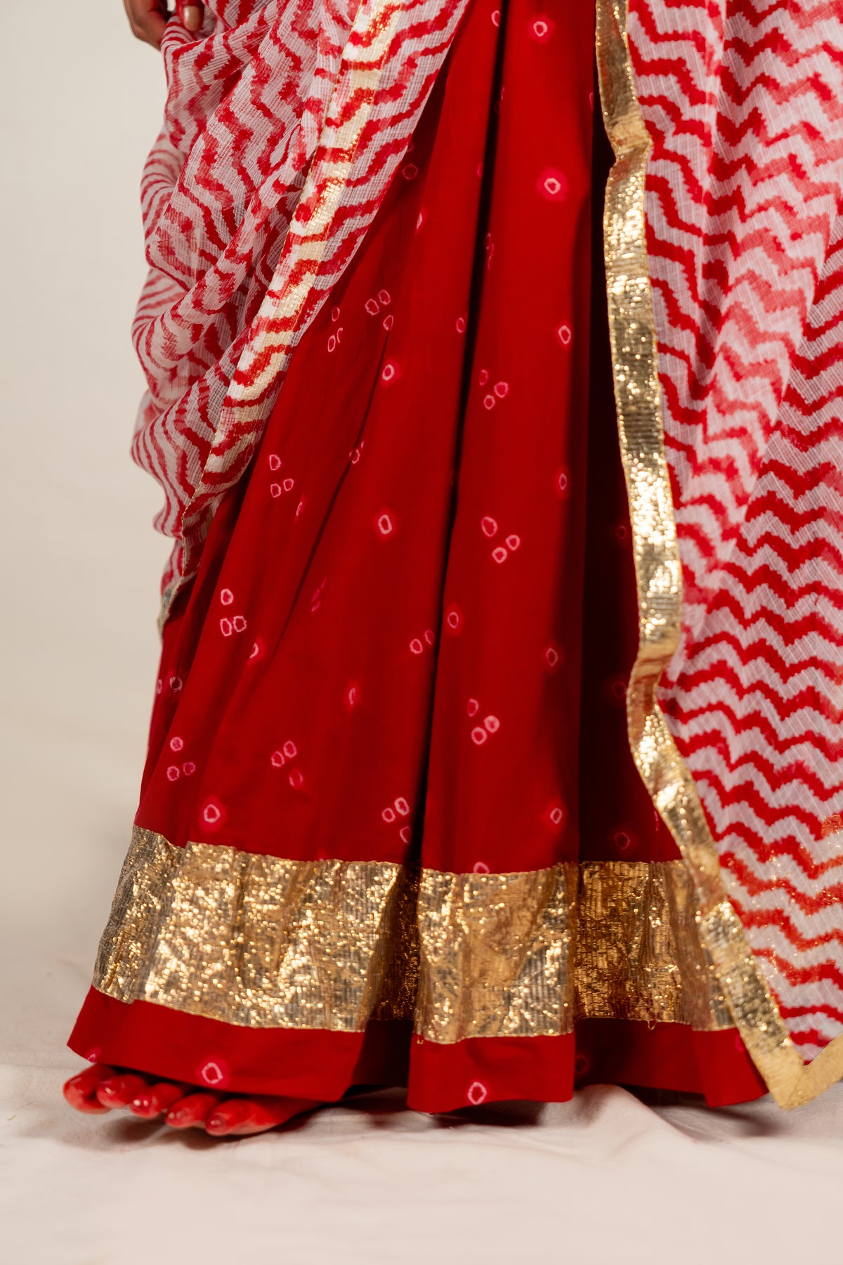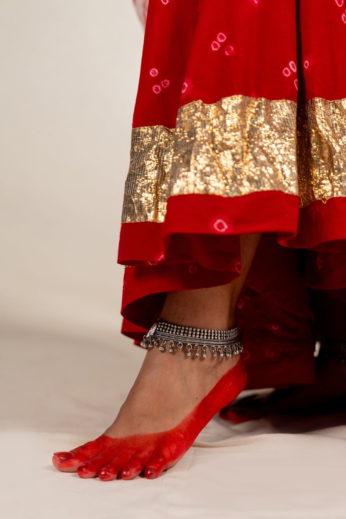 This flared cotton skirt in deep red is patterned with bandhej and finished with a golden lumbi border at the hem, bringing a festive richness to every twirl.