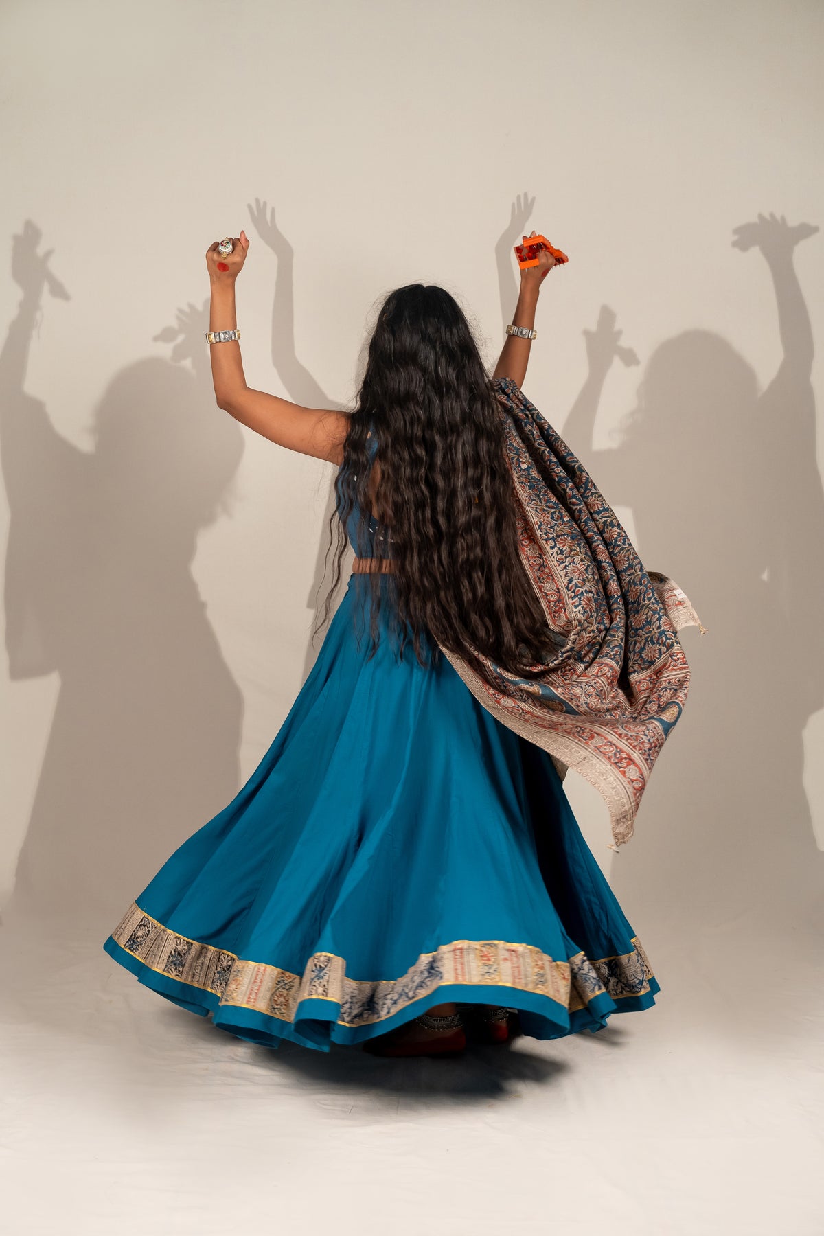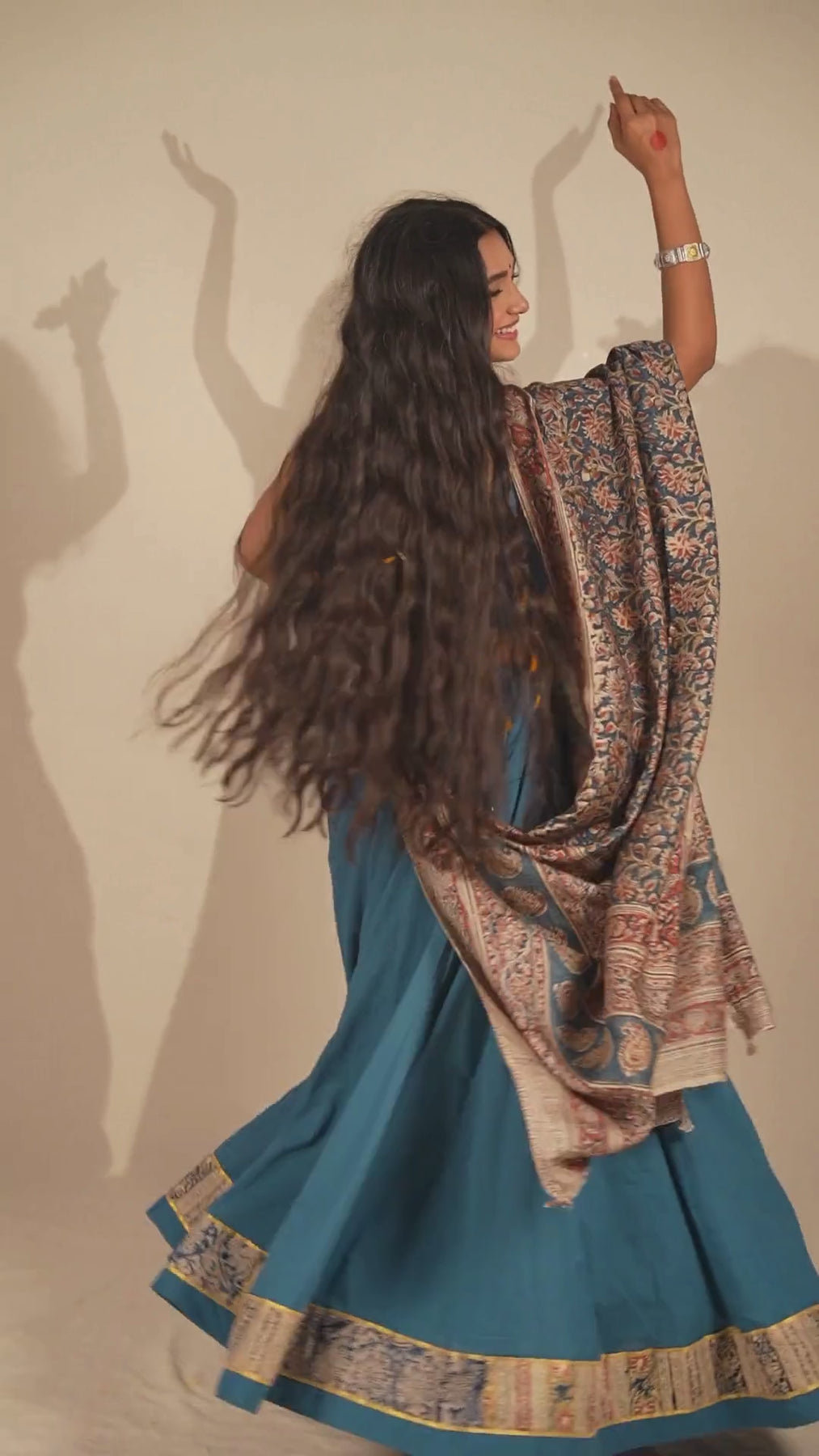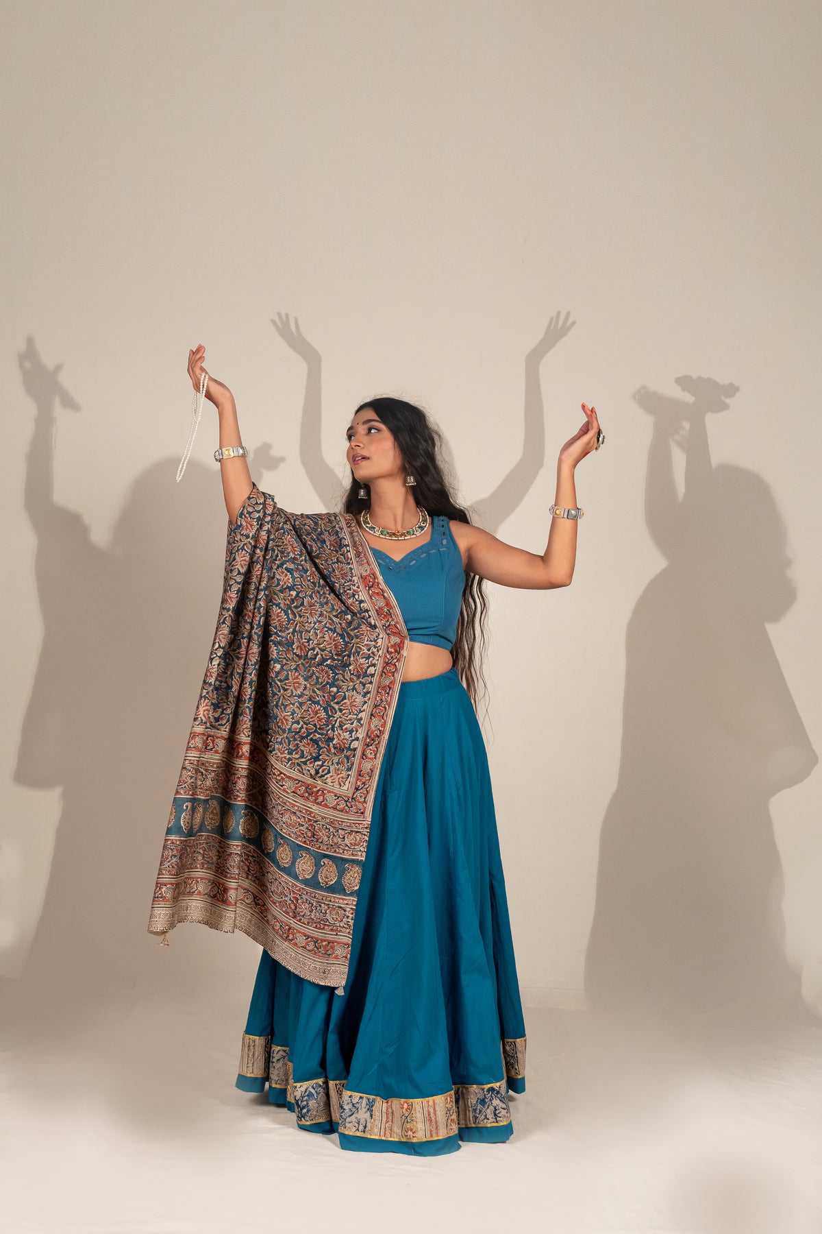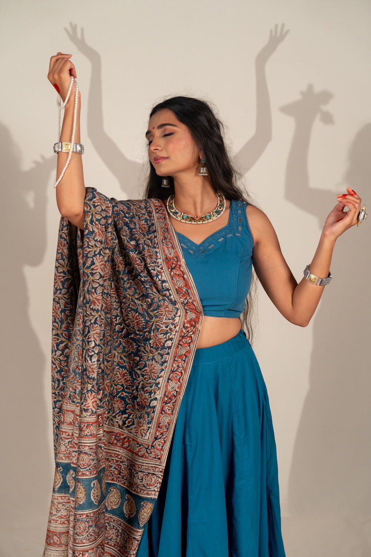A flowing solid cotton skirt in a rich blue shade, finished with an ornate kalamkari border at the hem. The bold color contrasts beautifully with the intricate artistry of the border, giving the silhouette both depth and elegance.